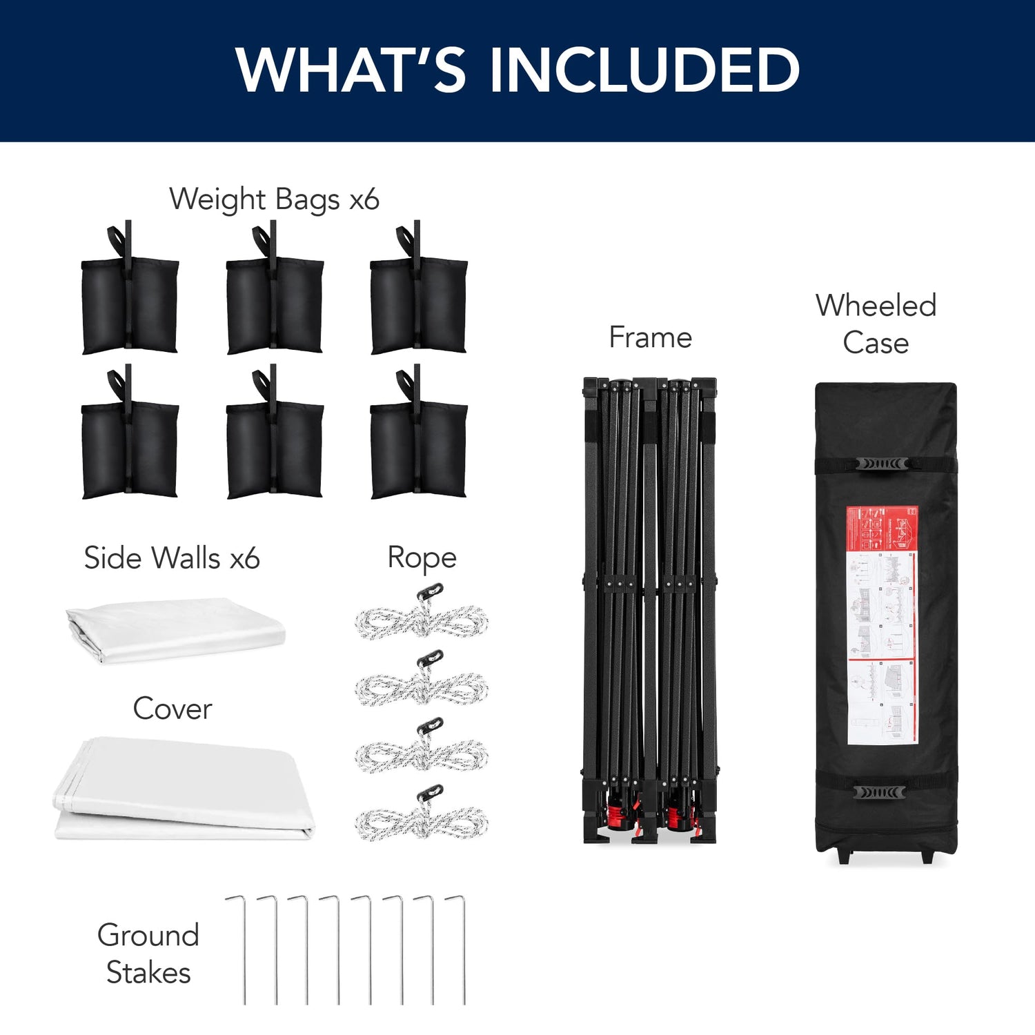 - BUILT FOR THE OUTDOORS: Crafted with a sturdy steel frame and flame-retardant polyester cover, this canopy is built for year-round use with a convenient rolling storage case-perfect for transport to and from events; OVERALL DIMENSIONS: 236.2"(L) x 118.1"(W) x 110.2"(H)