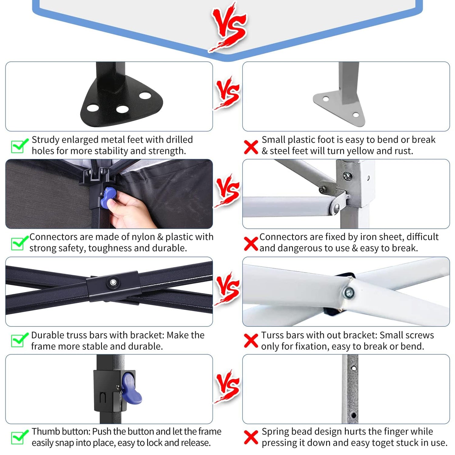 - 🔹10x10 Ez pop up frame: Strong thicker steel structure design, powder coated finishing, Good looking and rust resistance. 3 heights positions available: 79 inch, 83 inch and 89 inch. All the tarpaulin of the pop up canopy is made of high density oxford cloth, with the help of silver-plated PU lining, sealed stitching lines, UPF 50+, it is waterproof and can block 99% of harmful rays of sunlight.COBIZI canopy tent suitable for both sunny and rainy days.