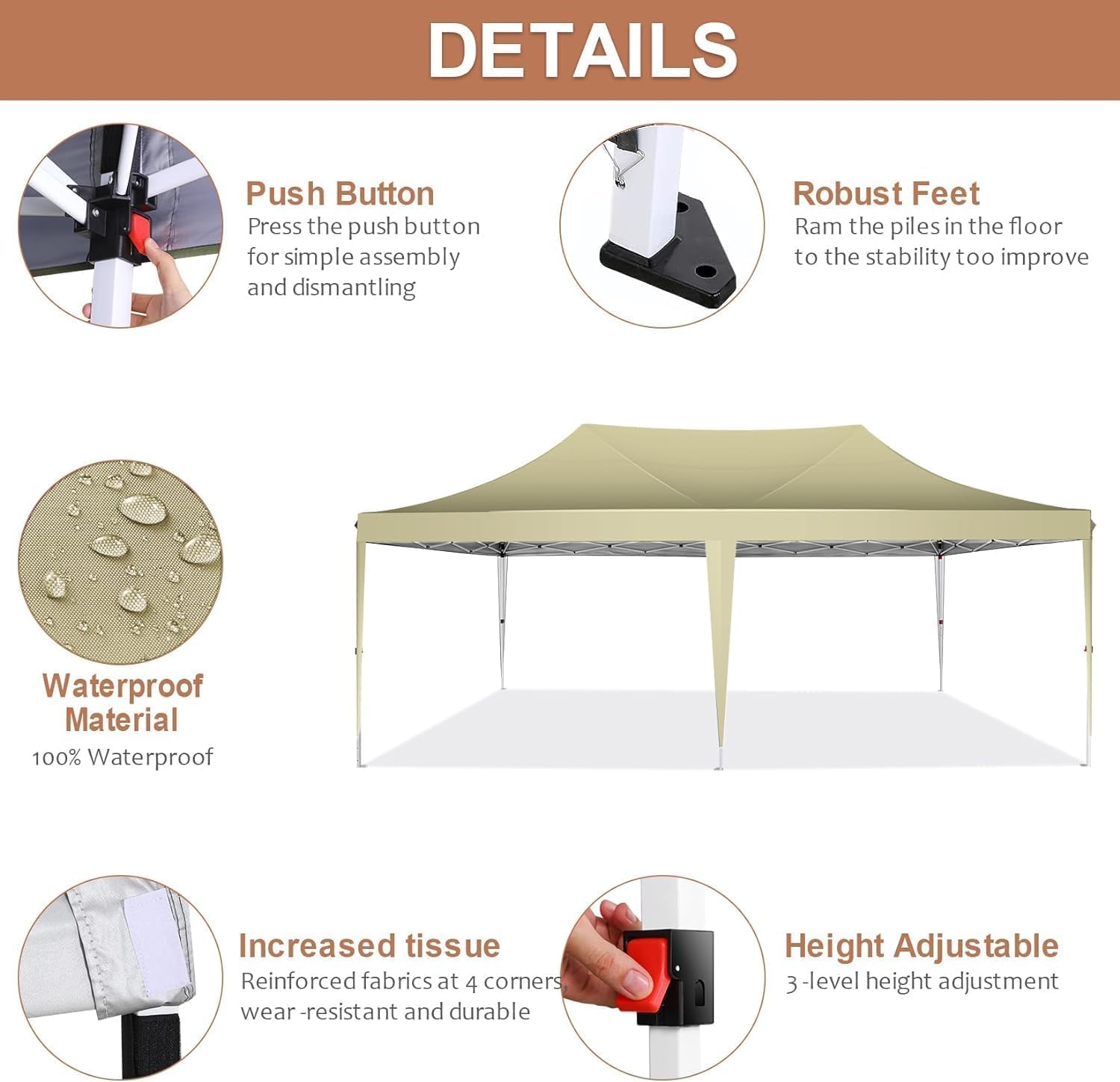 Details: 3.0 Upgrade Structure and Material: COBIZI Canopy Tent 10x20 has a strong structure and frame made of powder-coated and high-strength steel pipe, which is durable and rustproof. 10x20 tent fabric is made of 210D Oxford fabric with double PU coating, UPF 50+, which can block 99% of harmful rays. All seams are taped to prevent leaks . Easy to assemble: COBIZI pop up tent 10x20 does not require any tools and can be assembled by only 2-3 people. letting you spend more time enjoying the great outdoors and less time wrestling with equipment. 10x20ft Space& more Headroom: The 10x20 outdoor tents with waterproof walls can accommodate up to 20-30 standing guests. 10x20 garden tent features an elevated top frame design.With more headroom and a larger interior, you can enjoy the outdoors in style and comfort. 3 Adjustable Heights&Removable Sidewalls: COBIZI 10x20 event tent height adjustable, you can adjust it as you need, 300 cm - 310 cm - 320 cm.Improved thumb lock system can protect your fingers from pinching.The double-zippered walls provide airflow control, making it ideal for vendor booths at farmers' markets or outdoor exhibitions.COBIZI 10 by 20 tent includes 6 removable sidewalls is perfect for 4-Season and enhanced privacy. Package Includes and Service: COBIZI 10x20 Commercial Pop up Canopy Includes: 1 Canopy poles,1 Canopy Roof Fabric 6 Removable Sidewalls,1 Carry Bag , 6 Wind Ropes , 12 Stakes. If you have any questions during use, please feel free to contact us, we will provide satisfactory service