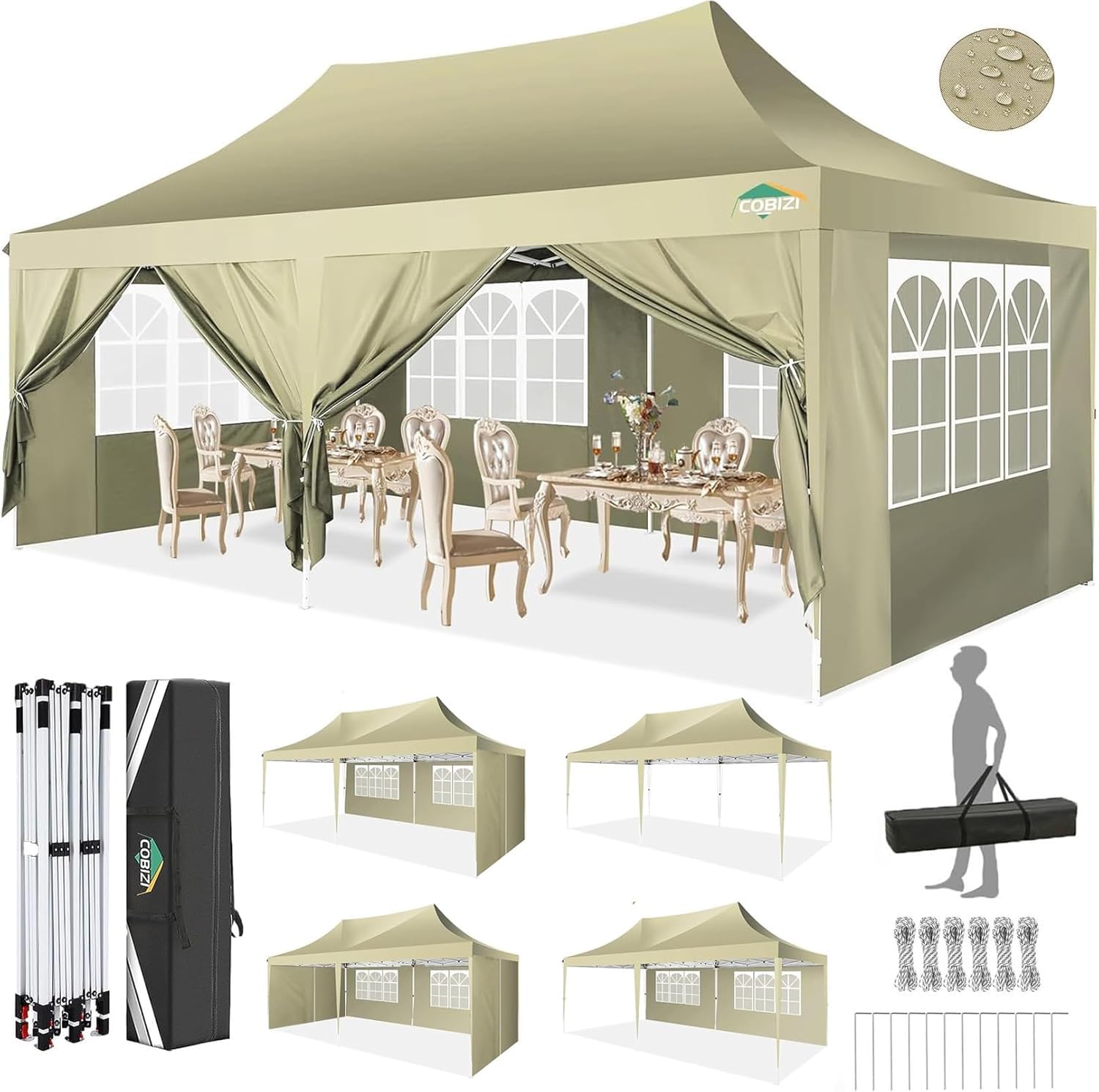 COBIZI 10x20 Pop Up Canopy Tent with Sidewalls,Party Tent Outdoor Gazebos, Waterproof & UV50+,3 Adjustable Heights,Higher Frame Design - Extra Tall for Parties Backyard,Weddings,Markets,(Khaki)