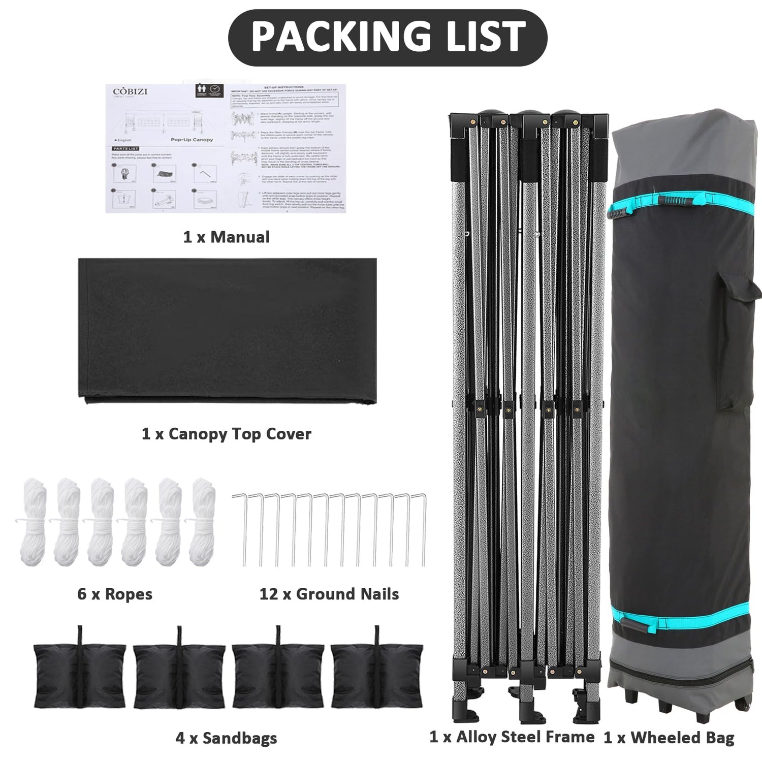- 【200 SQ Feet Shade Area】COBIZI 10x20 pop up tent provides 200 SQFT spacious covered space, it can easily accommodate 15-20 people, meet your different needs for holding large gatherings. Perfect for wedding, birthday party, market event and other larger events. When in use, always secure the 10x20 pop up tent with the included stakes and ropes to avoid damage. One year after-sale protection for canopy frame; Six months after-sale protection for fabrics and accessories.