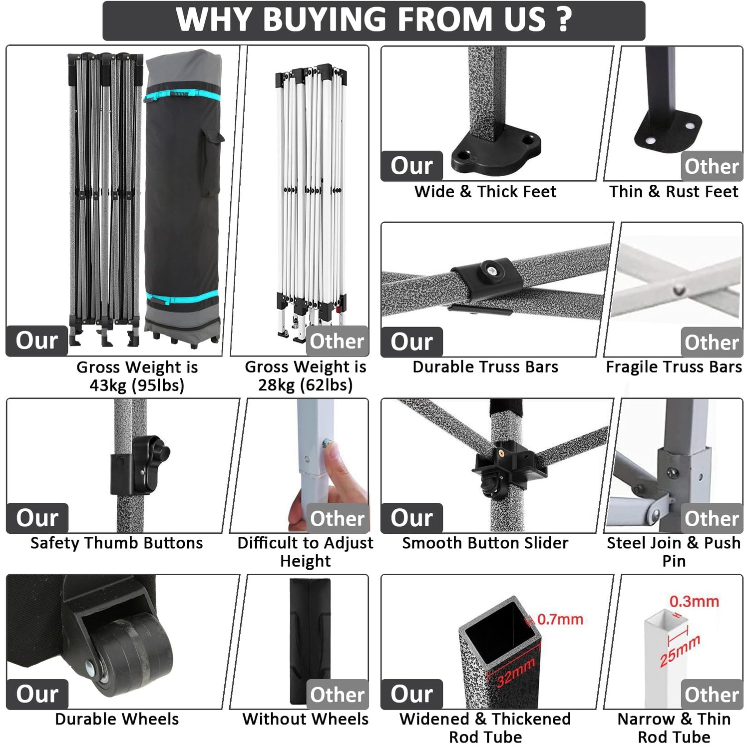 - 【3 Height Settings】10x20 pop up party tent straight leg has 3 height settings. Thumb latch lock system easy to lock and release, raise the pop up tent to a desired height. Canopy tent 10x20 straight leg height options: 220cm/86.6inch, 230cm/90.6inch, 240cm/94.5inch. Corresponding party tent center height options: 310cm/122.0inch, 320cm/126.0inch, 330cm/129.9inch. 10x20 canopy perfect for commercial activities, camping, festivals, tailgating, backyard events and etc..