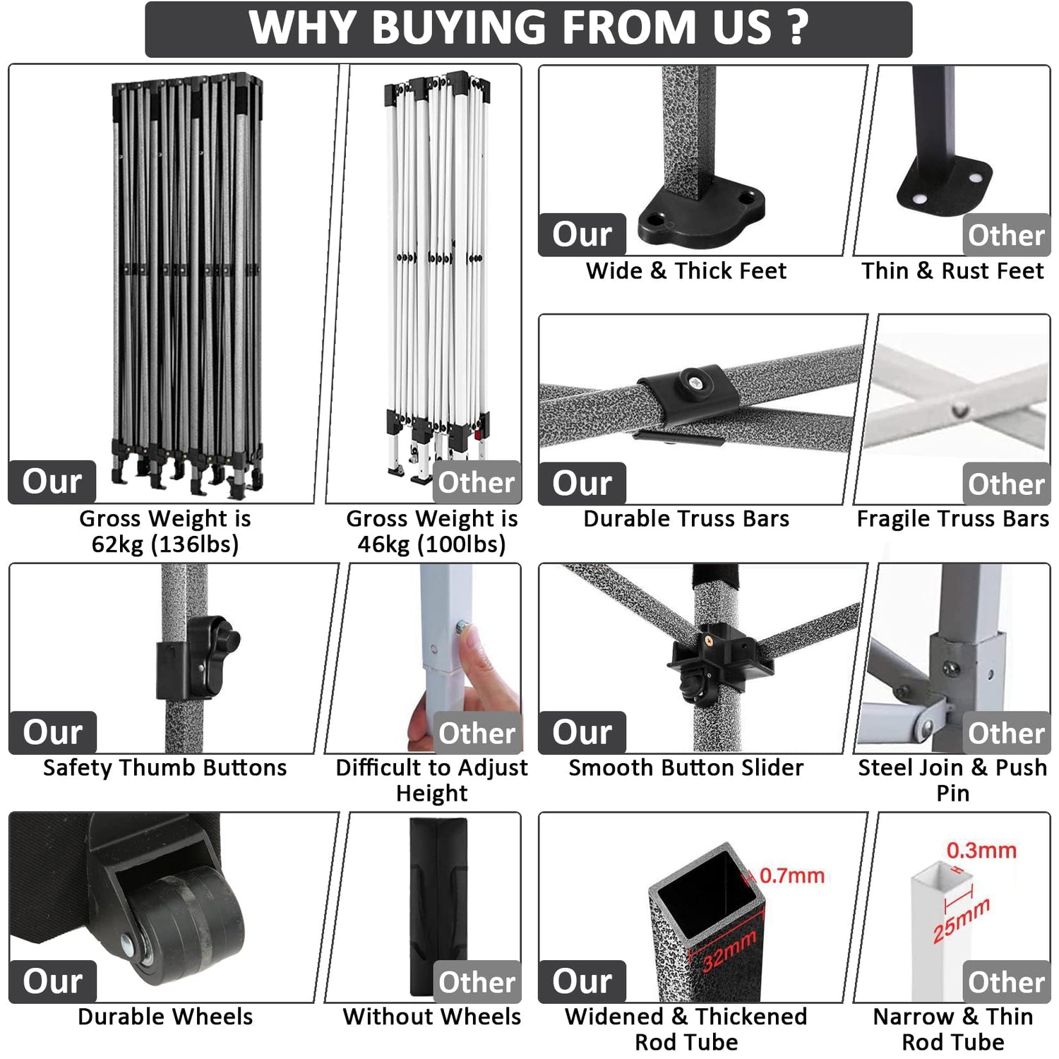 • 【3 Heights Setting】Canopy tent outdoor gazebo tent for parties 10x30 have 3 height settings . You can quickly and easily adjust three height positions by simply pulling the button outward: 220cm/86.6in, 230cm/90.5in, 240cm/94.5in, no tools required. COBIZI easy pop up canopy tent have upgraded buttons, which are easy to lock and release, adjust to avoid clamping your hand and be safer.