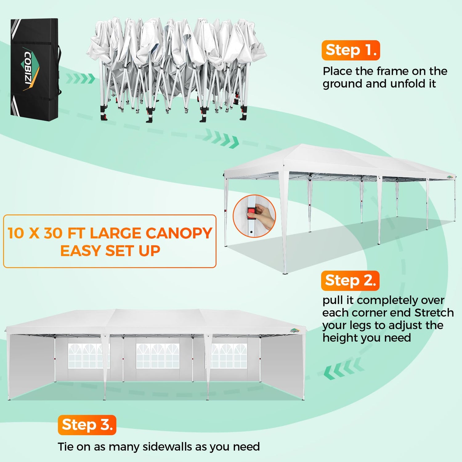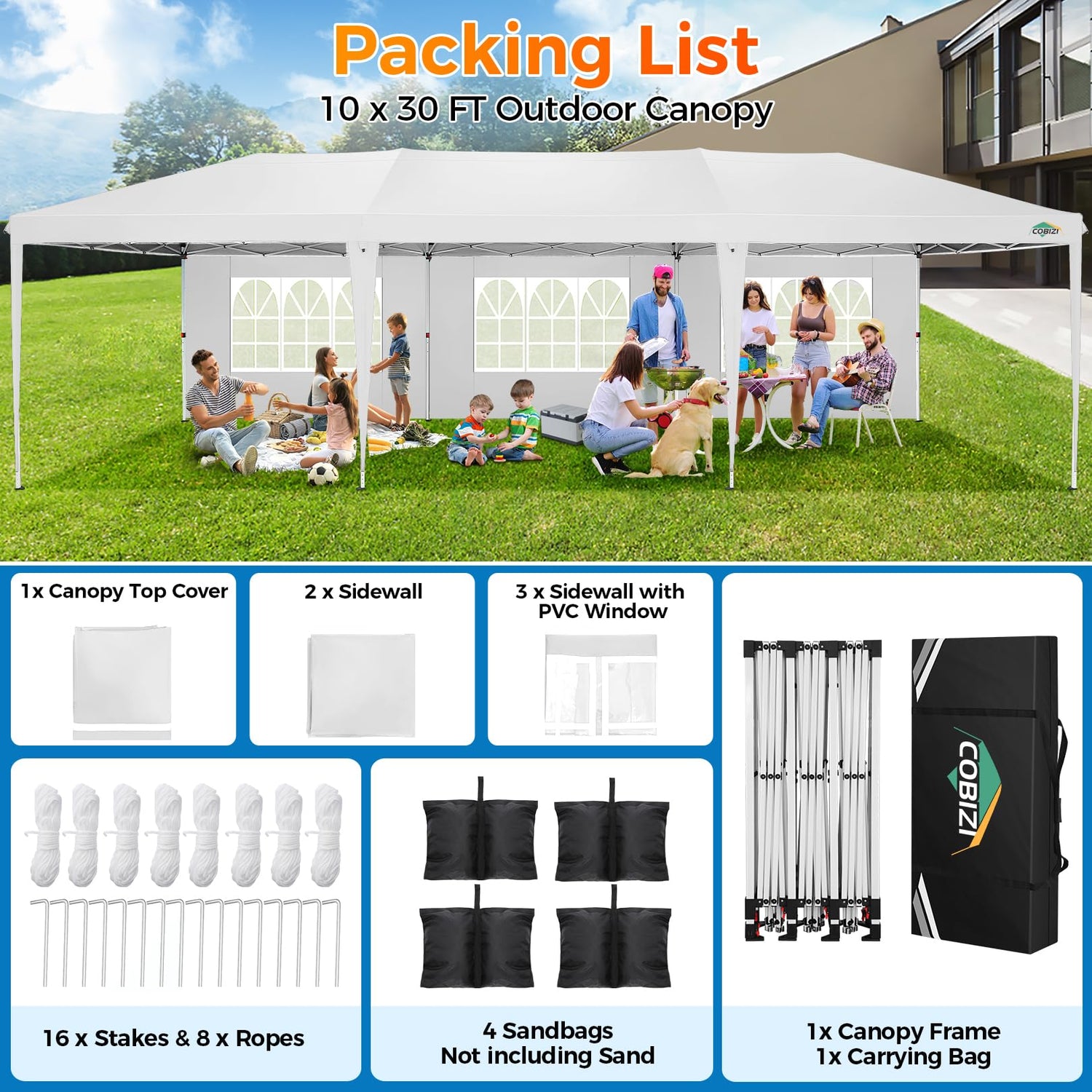 COBIZI 10x30 Pop Up Canopy Tent with Removable Sidewalls, Waterproof Portable Easy Up Canopy with Carry Bag, Instant Outdoor Shelter Tents for Parties, Events, Backyard Gatherings, Weddings, White
