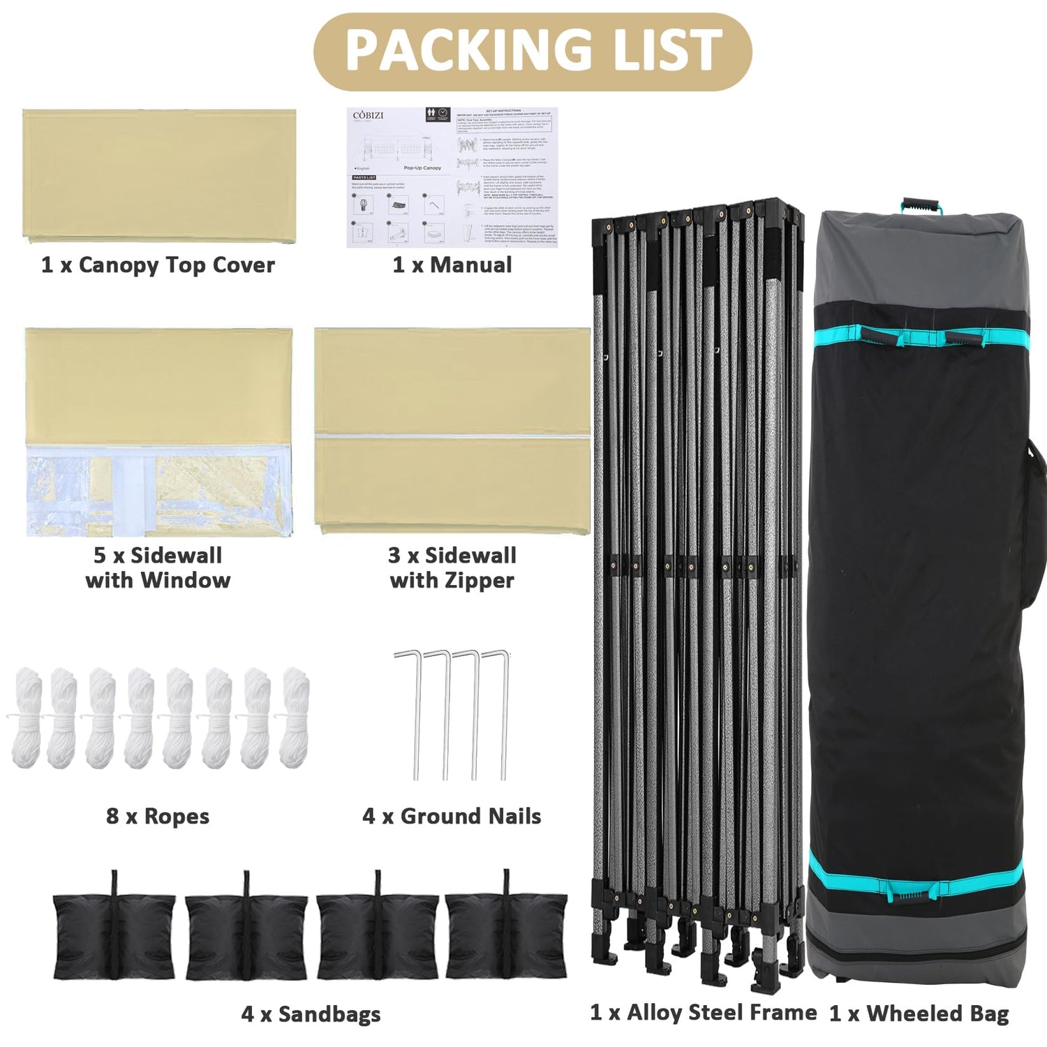 COBIZI 10x30 Pop Up Canopy with 8 Sidewall,Heavy Duty UPF 50+ All Season Wind Waterproof Commercial Outdoor Wedding Party Tents for Parties Canopy Gazebo with Roller Bag(10 x 30 ft Khaki)