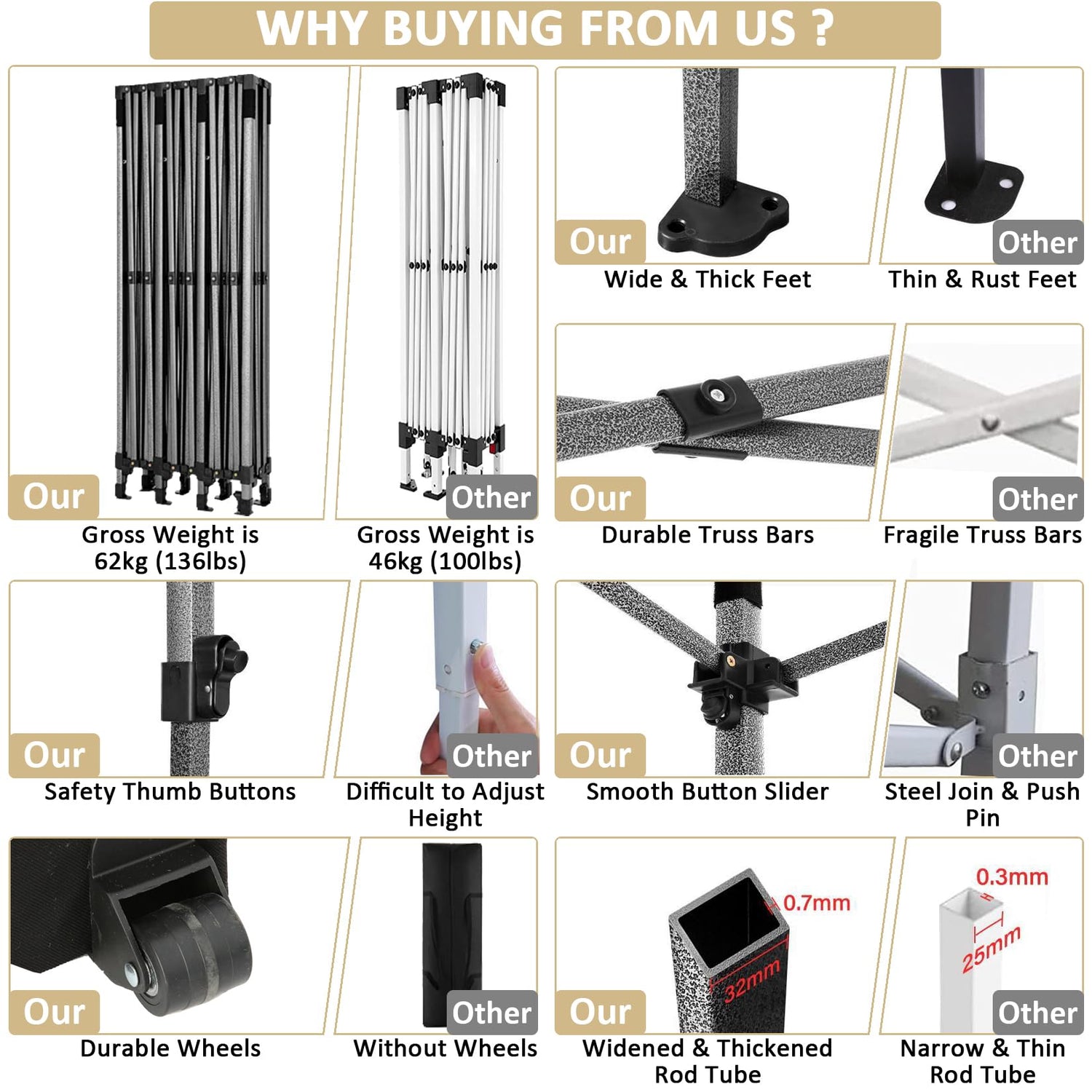 - 【3 Height Settings】10x30 pop up party tent straight leg has 3 height settings. Thumb latch lock system easy to lock and release, raise the pop up tent to a desired height. Canopy tent 10x30 straight leg height options: 220cm/86.6inch, 230cm/90.6inch, 240cm/94.5inch. Corresponding party tent center height options: 305cm/121.1inch, 315cm/124.0inch, 325cm/128.0inch. 10x30 canopy with sidewalls perfect for commercial activities, camping, festivals, tailgating, backyard events and etc..