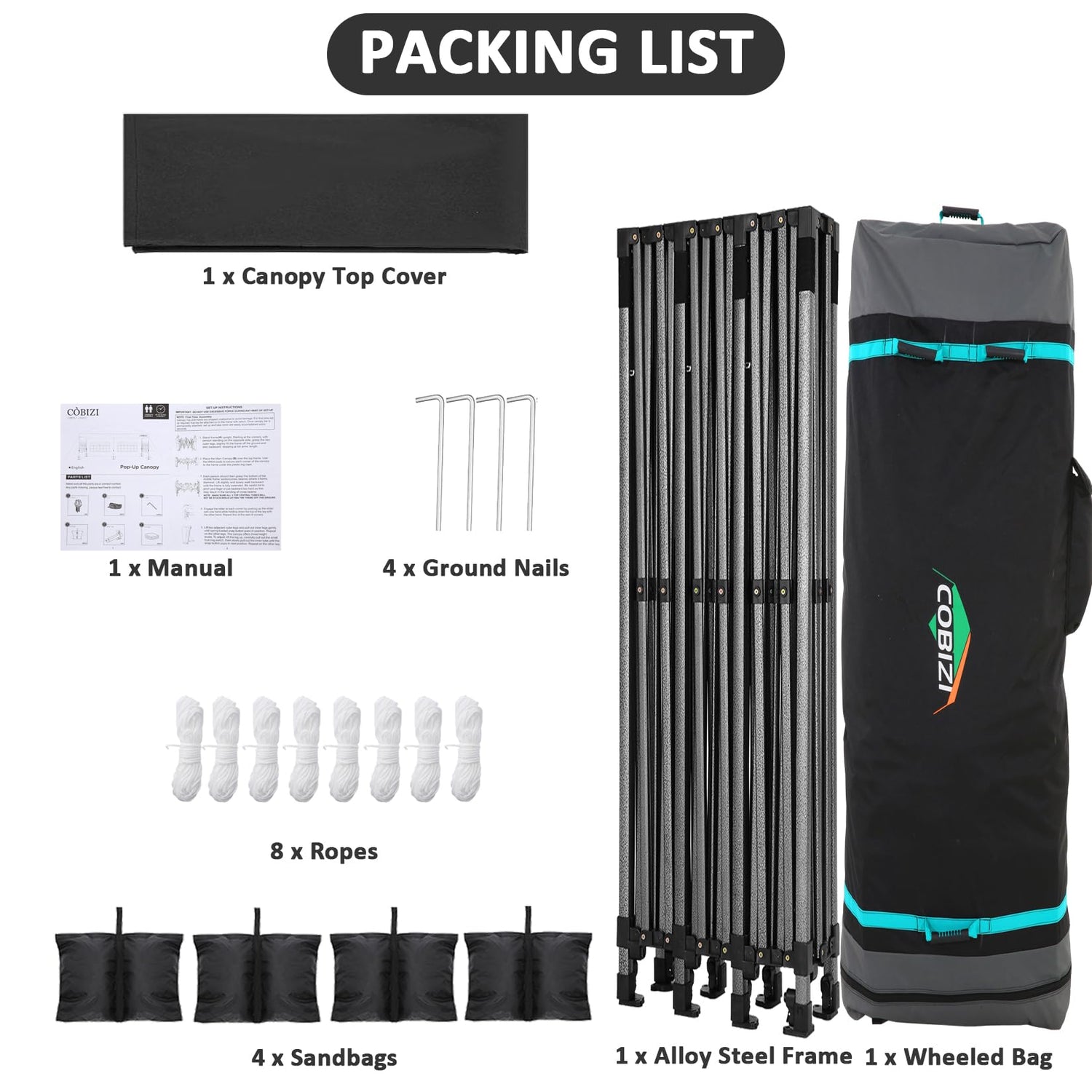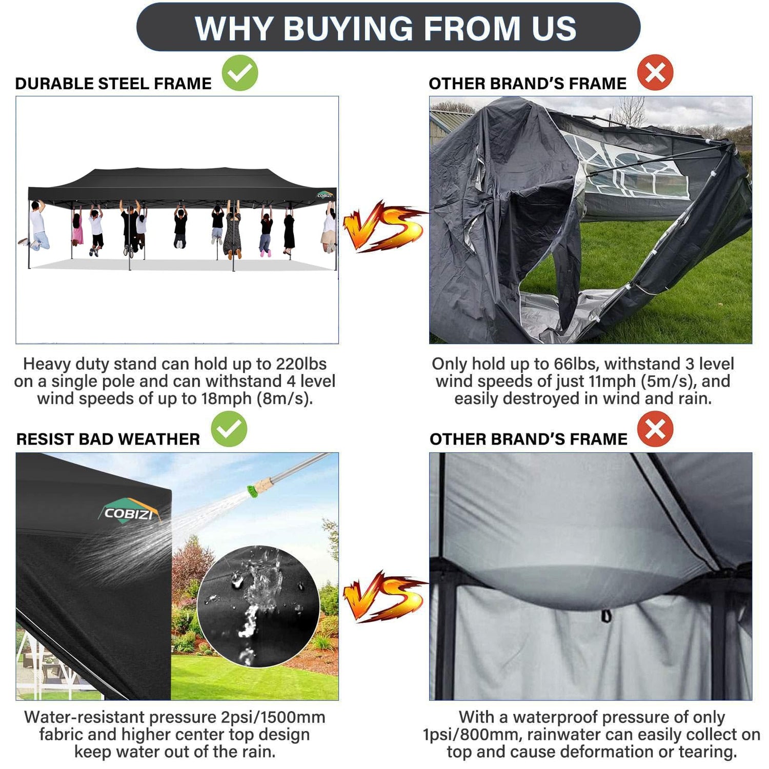 - 【300 SQ Feet Shade Area】COBIZI 10x30 pop up tent provides 300 SQFT spacious covered space, it can easily accommodate 15-20 people, meet your different needs for holding large gatherings. Perfect for wedding, birthday party, market event and other larger events. When in use, always secure the 10x30 pop up tent with the included stakes and ropes to avoid damage. One year after-sale protection for canopy frame; Six months after-sale protection for fabrics and accessories.
