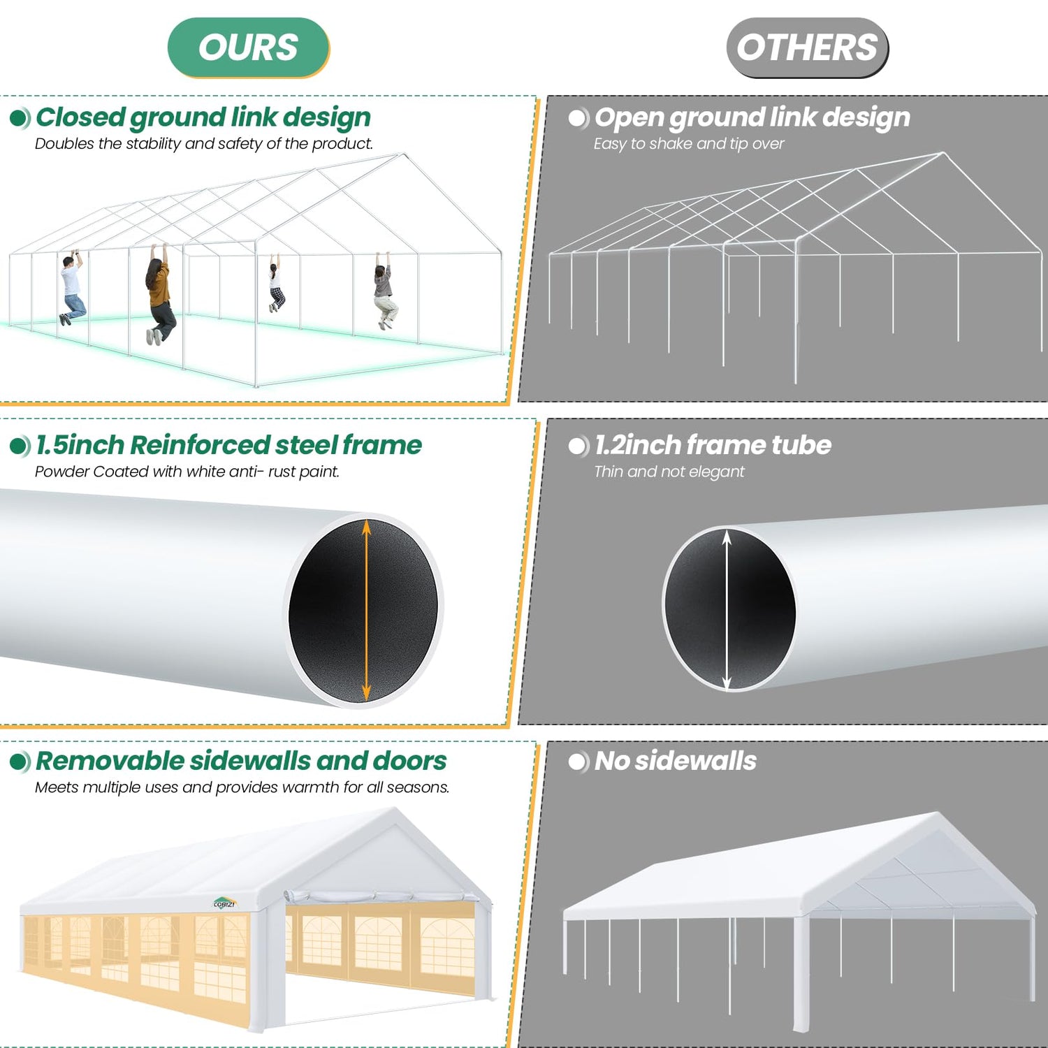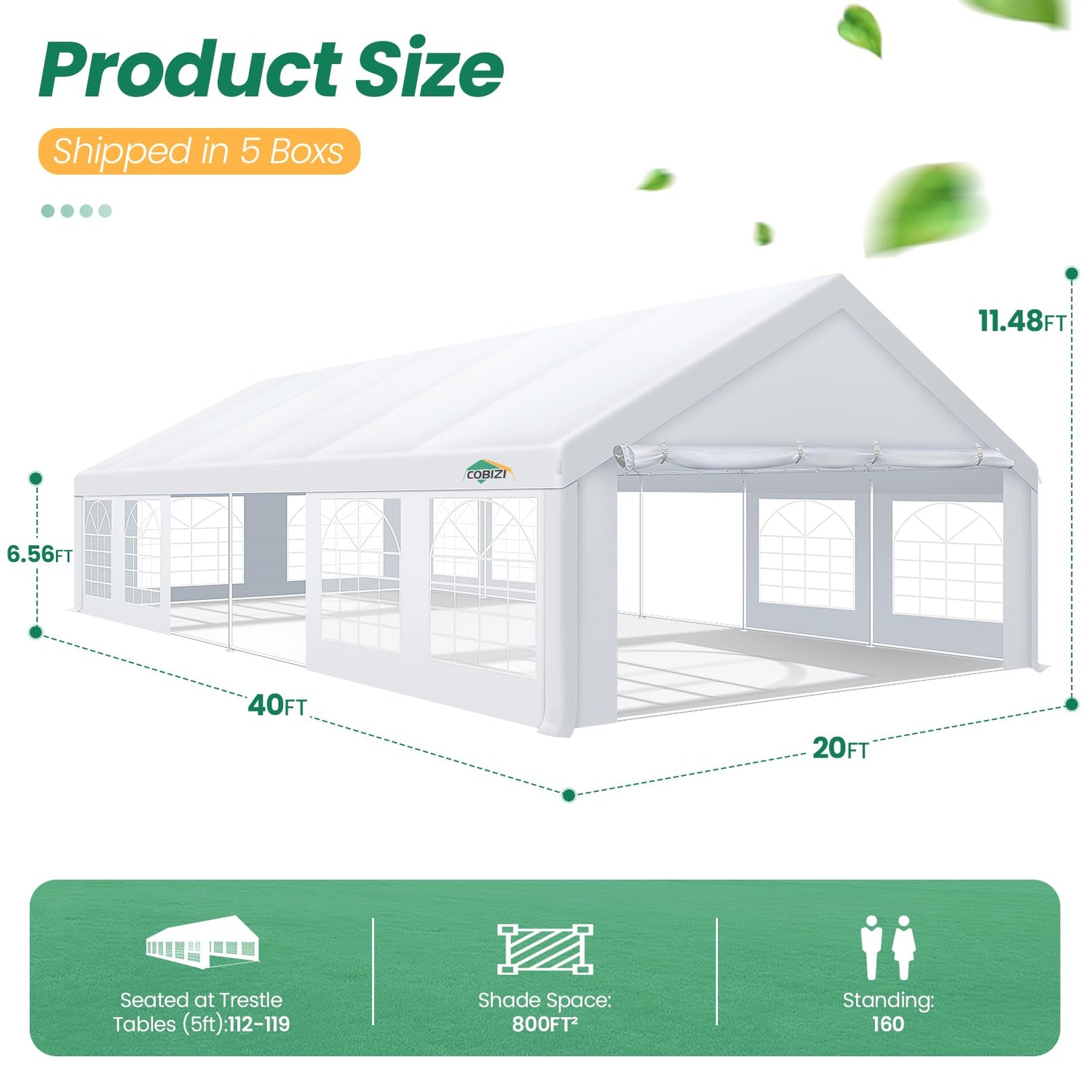 - 【Heavy duty Structure & Closed Extra Ground Bars】cobizi 20x40 party tent heavy duty made from 1.5inch diameter all metal tube frame with white paint coating, preventing chipping, peeling, rust, and corrosion. 20 x 40 tents for parties heavy duty stable triangular roof and closed ground link structure make the product more stable and less likely to shake than similar models on the market. cobizi 20x40 party tent Pegs and wind ropes, to make the event tents much safer and more stable.