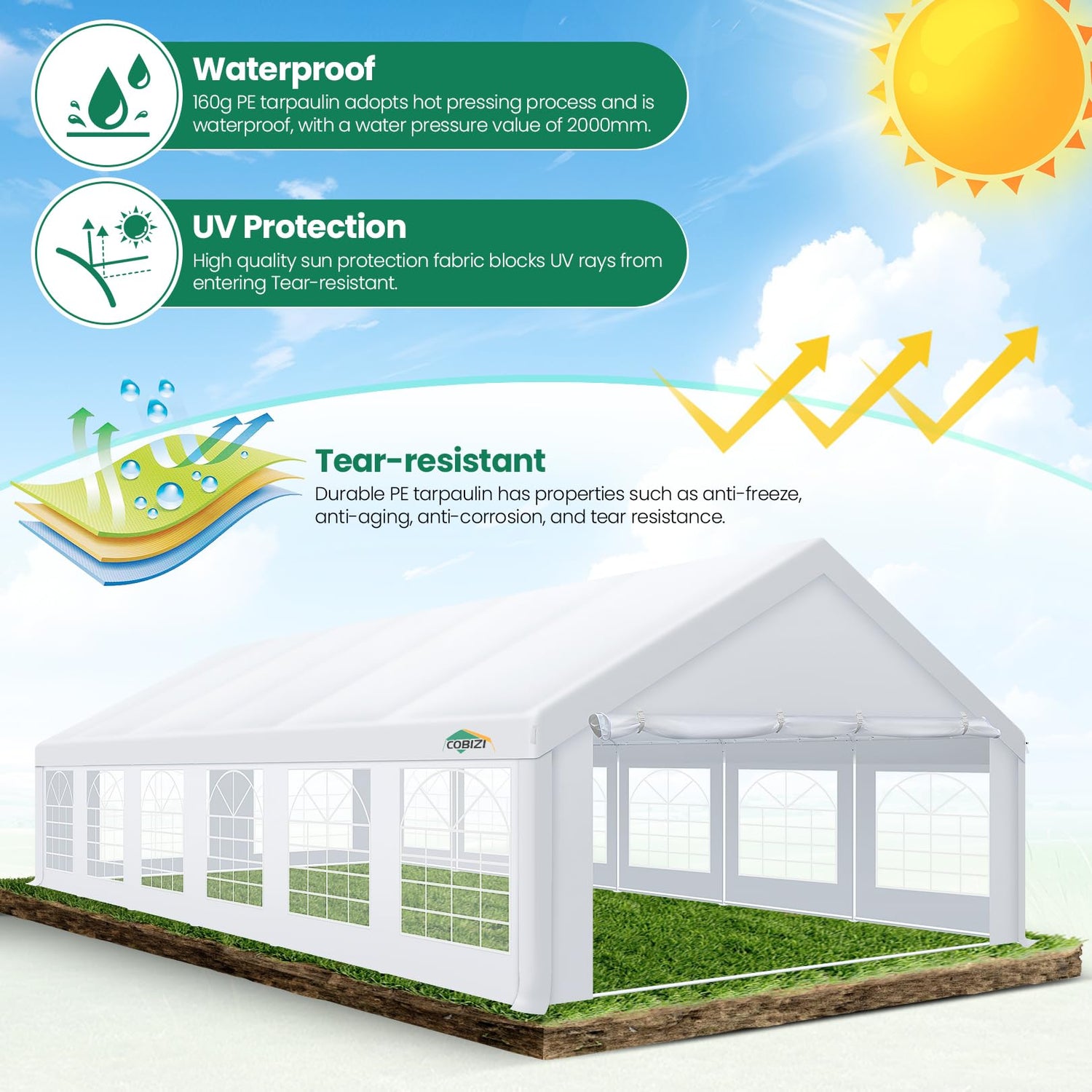 - 【All Season Tarp & Cathedral Windows】 This heavy duty party tent top cover is made of heat-sealed, triple-layer 160g polyethylene fabric can Block 99% of Harmful UV Rays, which is waterproof and windproof, rainproof, dustproof and anti-snow, tear resistant etc. Party tent waterproof PVC cathedral windows on the sides provide the tent with bright light and a good view.