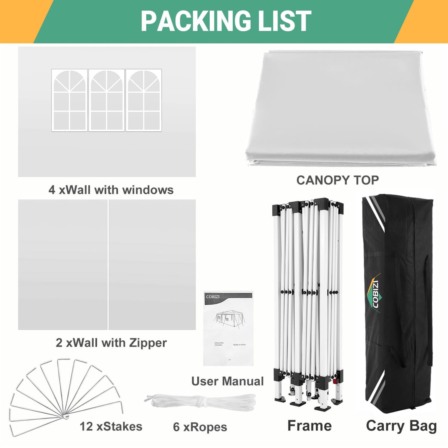 - 【High Quality】 Our COBIZI 10x20FT Pop-up canopy tent is made of high-quality Oxford fabric with PU coated, it's waterproof and blocks 99% of the sun's rays. High-grade durable steel frame with powder coated coating guarantees rust resistance and corrosion resistance. In order to protect the long-term use of the canopy tent, in extreme weather (such as storms and heavy rain), it is recommended to fold the canopy tent 10x20 and store it indoors.