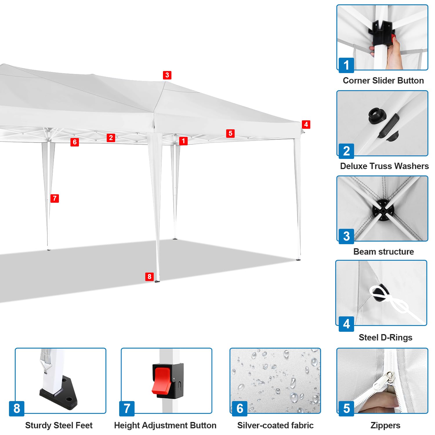 - 【Ultra-Stability】10 x 20 pop up canopy tent with 4 sidewalls + 2 door panels, this canopy tent 10x20 is made of powder-coated aluminum and thicken steel frames to enhance stability. The D rings on the corners can be easily attached to the ropes and post to increase stability and windresistance when rains or snows.