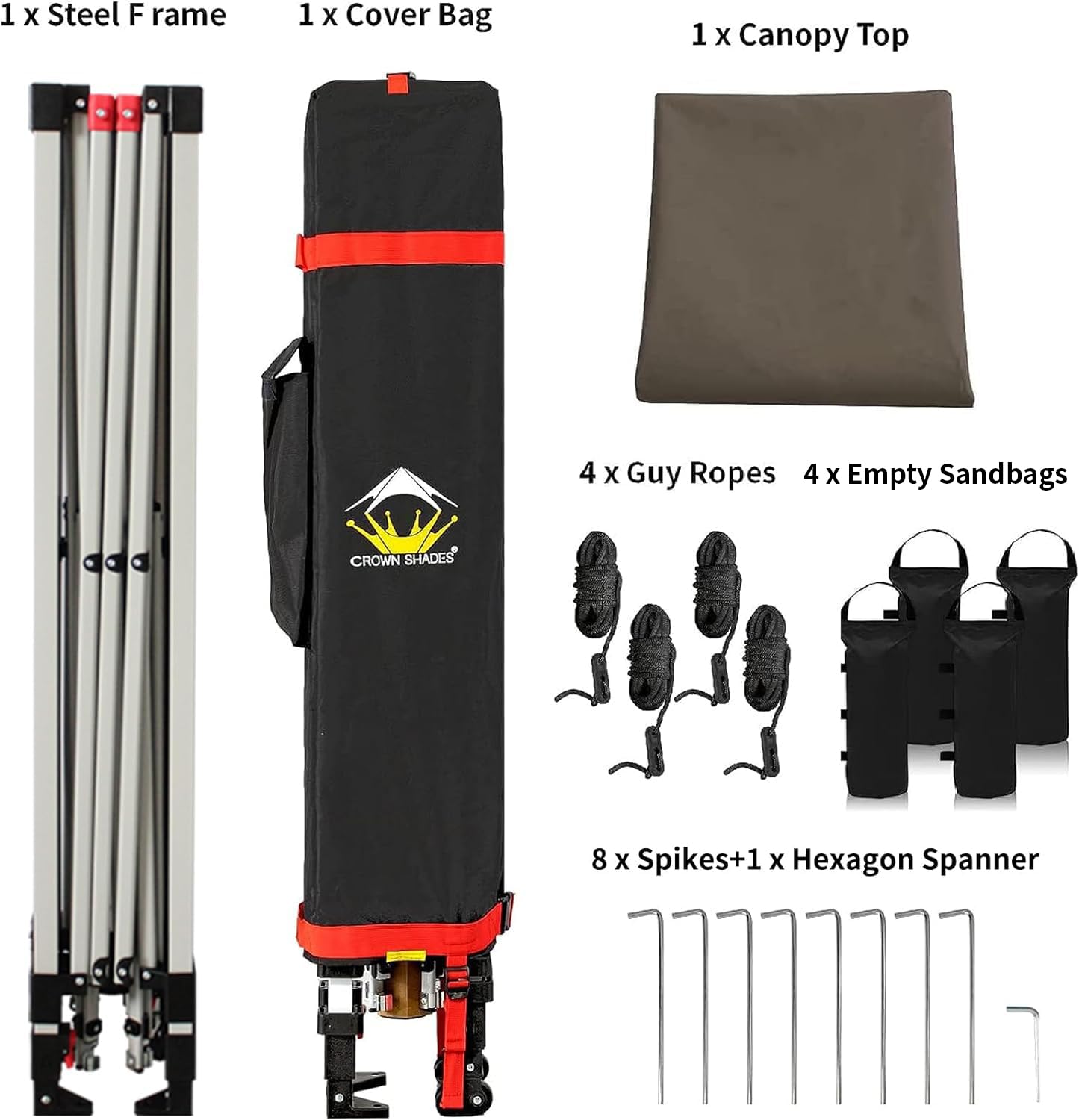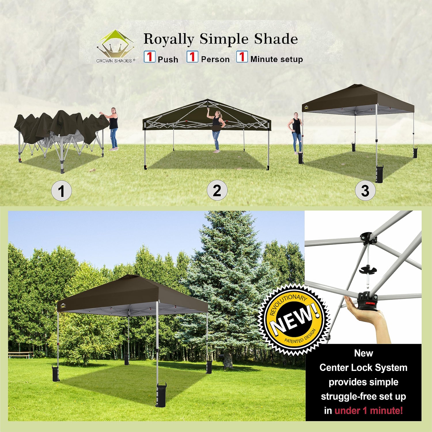 CROWN SHADES 10x10 Pop Up Canopy - Beach Tent with One Push Setup - Outdoor Sun Shade for Events, Parties, Camping - Gazebo with STO-N-Go Cover Bag, Silver Coated Top, 3 Height& 4 Sand Bags, Coffee