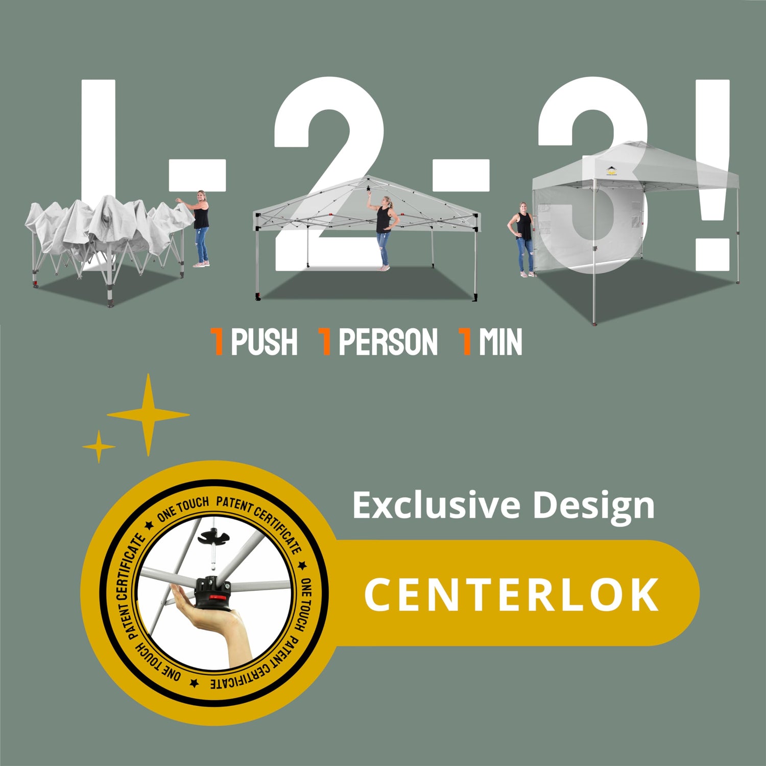 - ONE BUTTON EASY SET UP - Our 10x10 pop up canopy tent features patented one push center lock tech. With just a single push, the central hub locks the poles in place. Designed for the next generation, this outdoor canopy for patio can be set up by two people in seconds without any tools. Three adjustable height settings with soft, pinch-free buttons ensure convenience and safety, making it perfect for camping, beach outings, craft fairs, tailgating, farmer markets, outdoor BBQs, and more