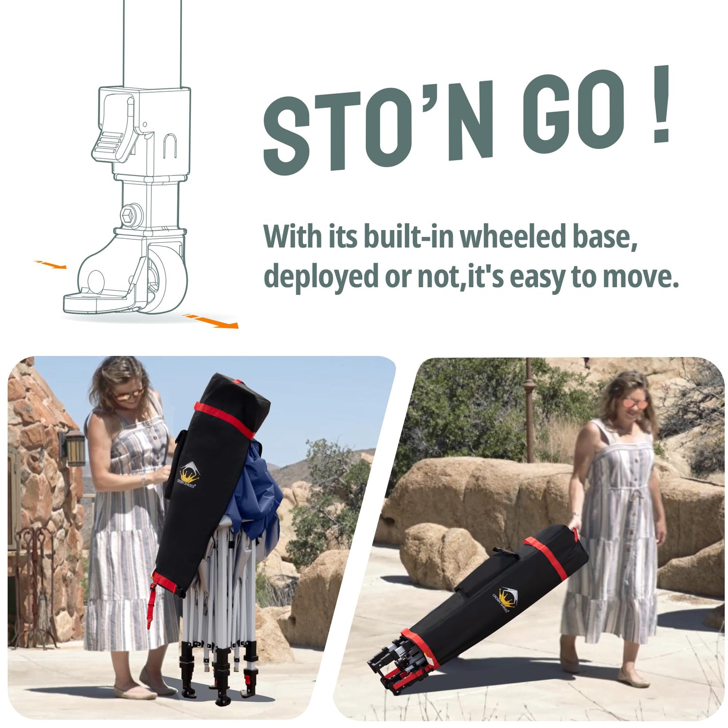 - STO’ N GO SYSTEM - Our lift-free system makes collapsing, storing, and transporting the 10x10 tent a breeze. The 10x10 tents can be stored with the fabric attached, with a specialized pocket for 4 sandbags, 8 stakes, and 4 guy ropes. Integrated wheels in the feet allow easy movement even when the instant shelter tent is set up, by simply lifting the side without wheels. This feature is especially useful for quick setup and takedown at locations like the patio or sports events