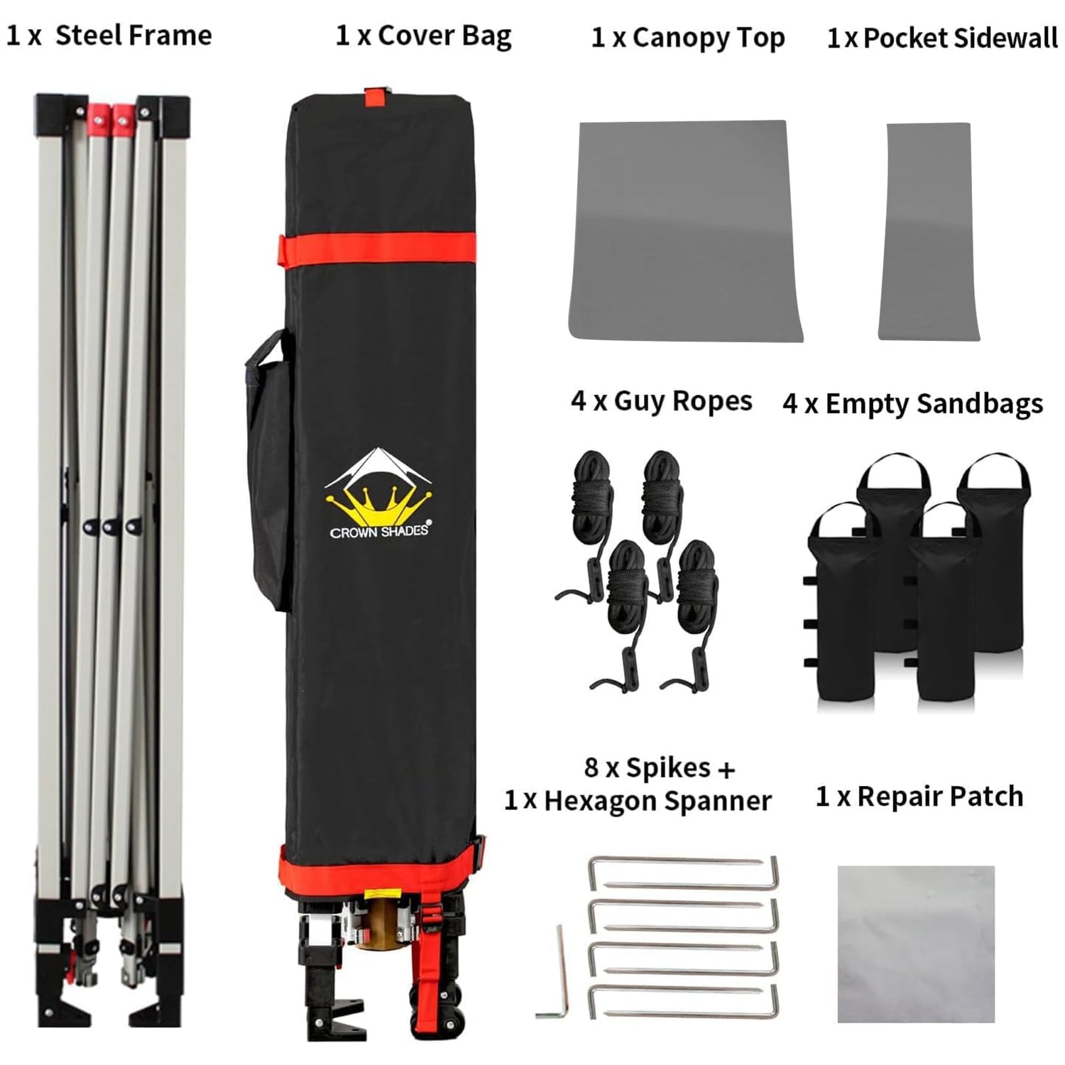 - STO’ N GO SYSTEM - Our lift-free storage and transport system makes it easy to collapse the canopy, cover it with the bag, and roll it away. The canopy can be stored with the fabric attached, with a specialized pocket for the sidewall, 4 sandbags, 8 stakes, and 4 guy ropes. Integrated wheels in the feet allow easy movement even when the canopy is set up, by simply lifting the side without wheels. This feature is useful for quick setup and takedown at locations like the beach, park, or market.