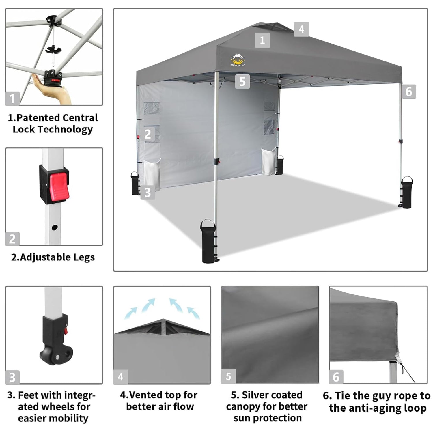 Details: CROWN SHADES Canopy Tent 10x10 Pop Up Canopy Outdoor Shade with Pockets Sidewall, Easy Up Sun Shelter with One Person Set Up Center Lock, Portable Instant Camping Beach Canopy Tents, Grid Grey
