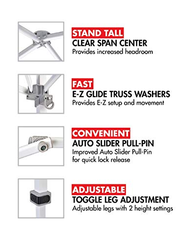 • NEW - TOGGLE LEG ADJUSTMENT WITH 2 HEIGHT SETTINGS - The improved toggle leg adjustment will keep your fingers pinch-free and are easier to unlatch. Two different height settings allow you to pick the height that best suits your needs. Peak height options: High 9'7”, Low 9'3". Valance clearance heights: High 6’6”, Low 6’2".