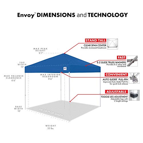 E-Z UP Envoy Outdoor Canopy Pop Up Tent, 10' x 10', Roller Bag, 4-Piece Spike Set, Recreational Grade, Royal Blue Top