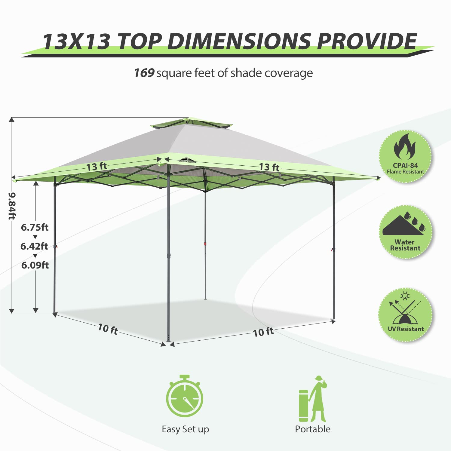 - VENTED TOP & AUTOMATIC EXTENDED EAVES: Stay cool with the EAGLE PEAK VENT that allows for greater airflow while you work or relax. The canopy’s automatically extending eaves open without any manual assembly and, combined with a sturdy straight-leg design, provides maximum coverage so 8 or more people can enjoy the spacious 169 square feet of shade. The easily adjustable telescoping 3-position steel frame is perfect for adjusting the canopy for your preferred coverage