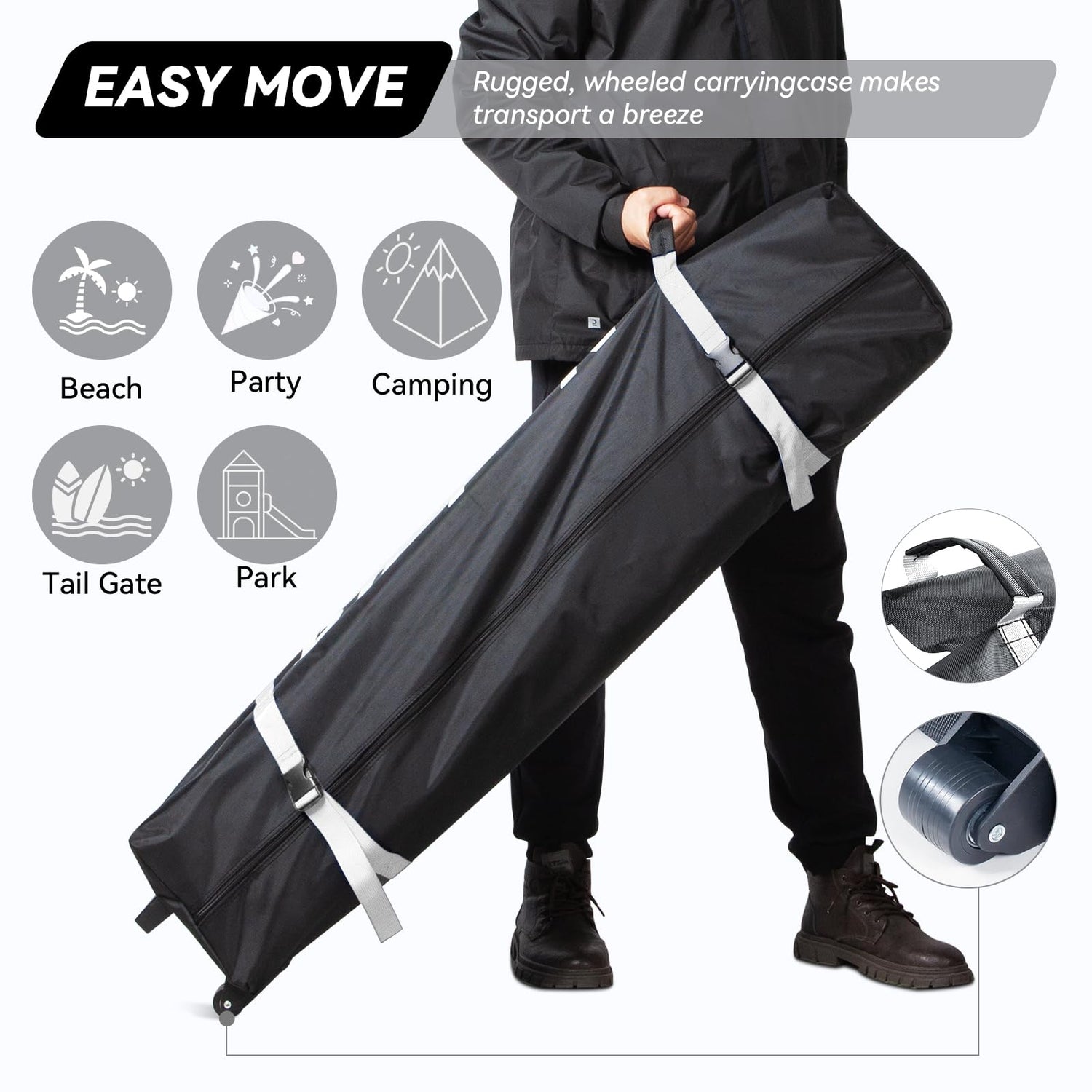 - PREMIUM ROLLING STORAGE CASE: Compact canopy with a click of a button and easily transport with wheels and rugged handle.
