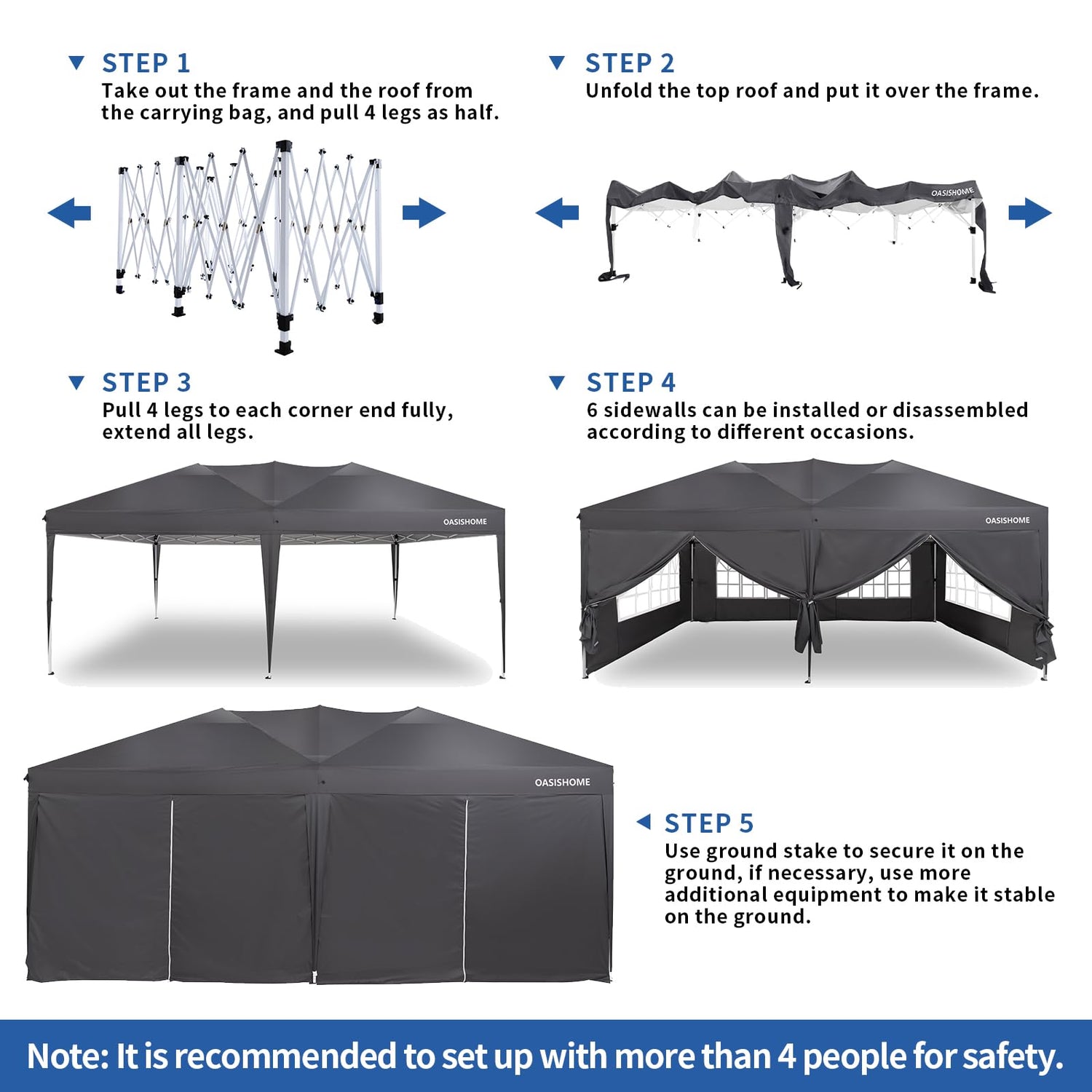 - 3. Set up is very easy, to finish the entire assembly work only needs 3-4 persons and takes a few minutes without tools. Step 1: take out the frame from the bag and unfold it ajar, unfold the top roof and put it over the frame; Step 2: pull 4 corner legs to each corner end fully, extend all 6 legs. Step 3: 6 sidewalls can be installed or disassembled according to different occasions. Three different sidewall height settings, more headroom for inside activitie.