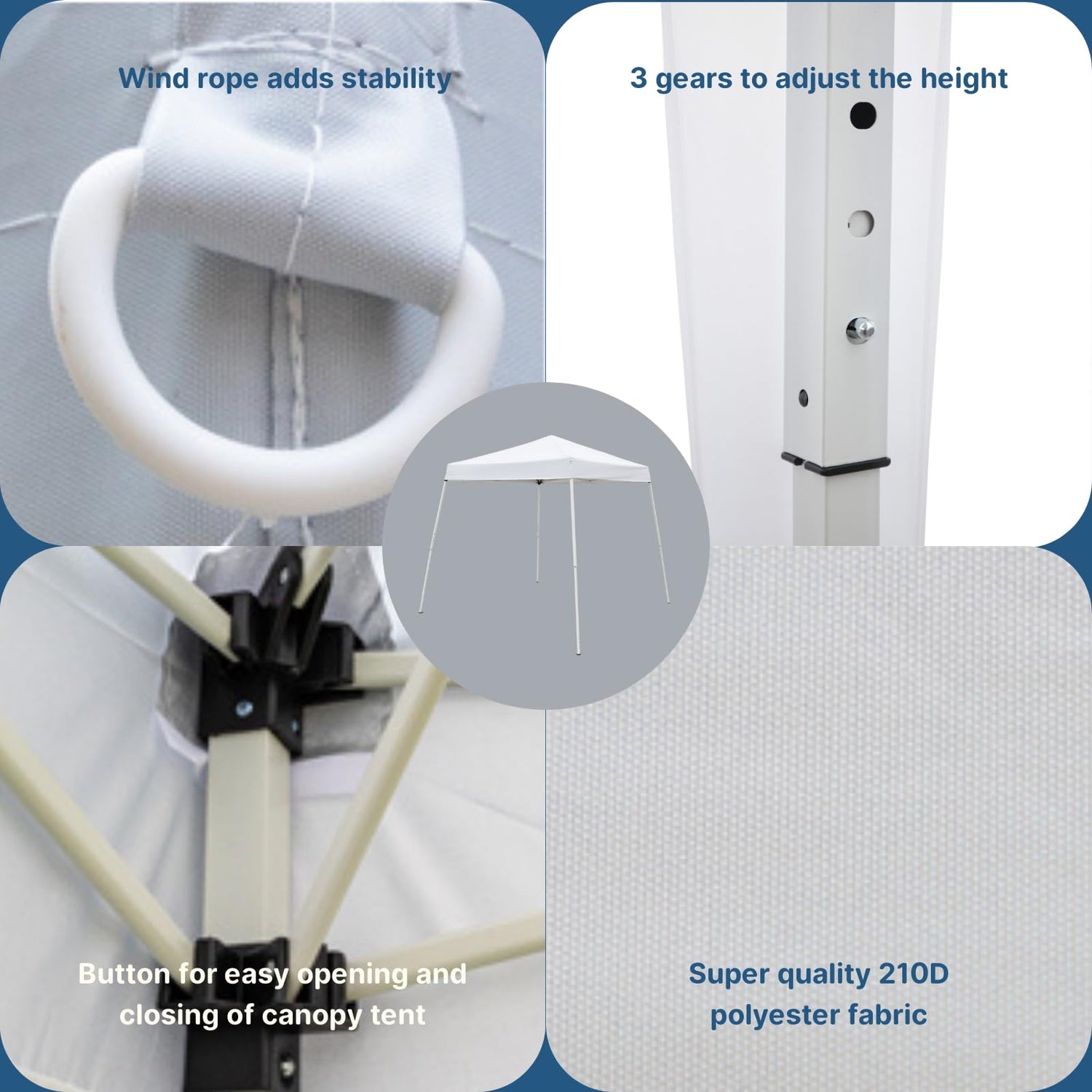 • 【OVERALL DIAMENSION】7.9'x7.9' (2.4m*2.4m)base slant leg outdoor canopy tent can hold up to 5-7 people. 3 heights to adjust. From gound to tent top: 7.3ft/7.6ft/7.9ft