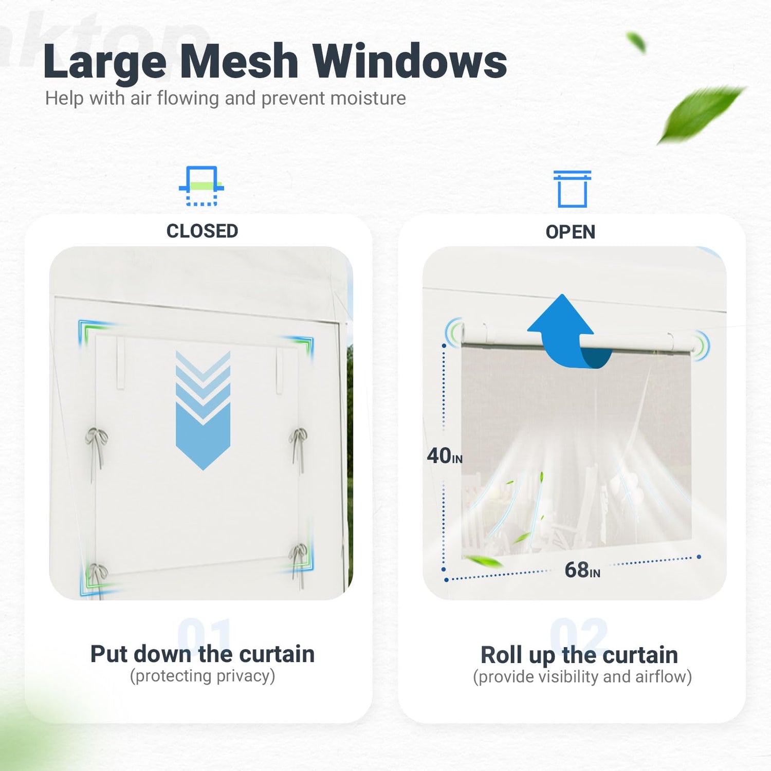 - 🎇【MESH WINDOW SIDEWALL】:The sidewall of this outdoor party tent has 6 Mesh Windows & Window Covers, which can be used at any time according to the seasonal climate, keep the summer ventilated and warm in winter, create a perfect space for your party at anytime.