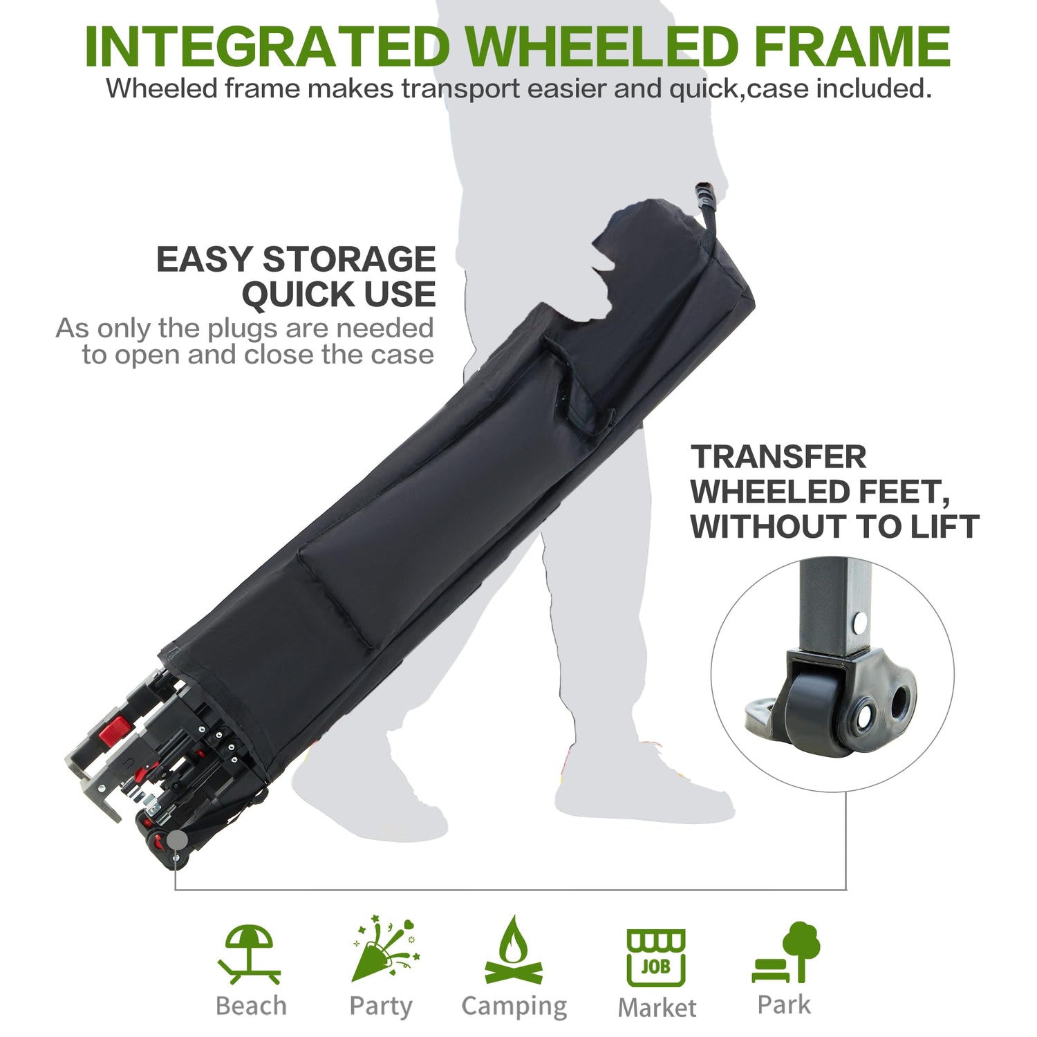 • βœ…γ€π„π€π’πˆπ„π’π“ 𝐒𝐄𝐓𝐔𝐏 𝐈𝐍 πŒπˆππ”π“π„π’γ€‘The patented central lock system allows one person to set it up in a matter of seconds without any tools.The canopy tent frame is designed by wheels therefore is easy to set up by 3 steps. Firstly, we pull out the canopy frame legs, then we tie the top cover. The final step is to push the lock botton to open the tent.