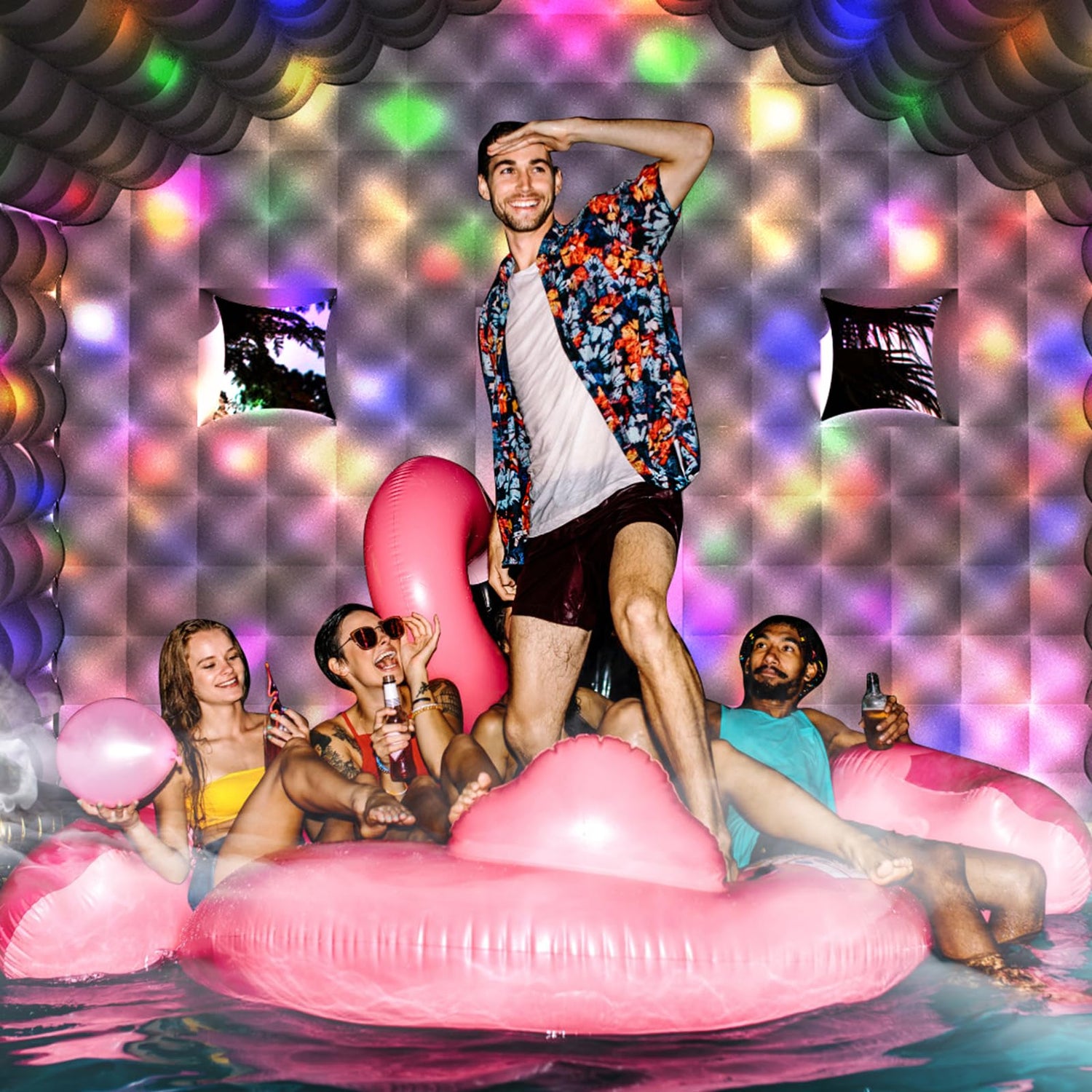 - Interior Decoration Highlights: ① A 51.2x31.5 inch Velcro area above the front entrance lets you add DIY personalized signs. ② The interior ceiling of the inflatable nightclub cube features 5 rope loops for hanging LED lights, disco balls, or other decorations to create a captivating atmosphere. ③ The interior side walls feature multiple rope loops for weaving light strips or additional decor. ④ A small hole at the back door's bottom allows for a fog machine, enhancing the visual experience.