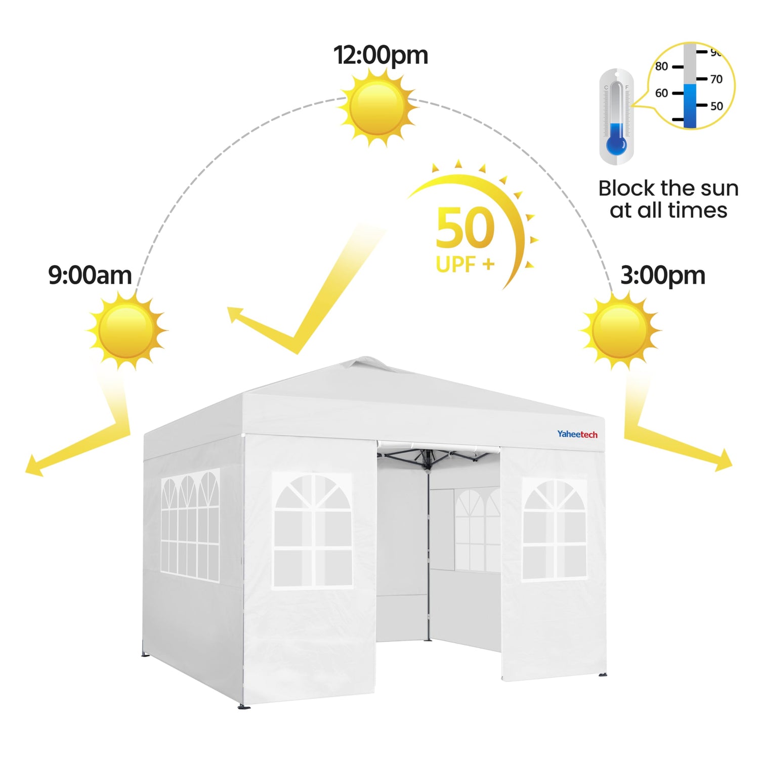 - Durable Materials: This 10ft × 10ft pop-up canopy is crafted from water-resistant polyester fabric with UPF 50+ UV protective layer. The frame is made from powder-coated steel for added strength