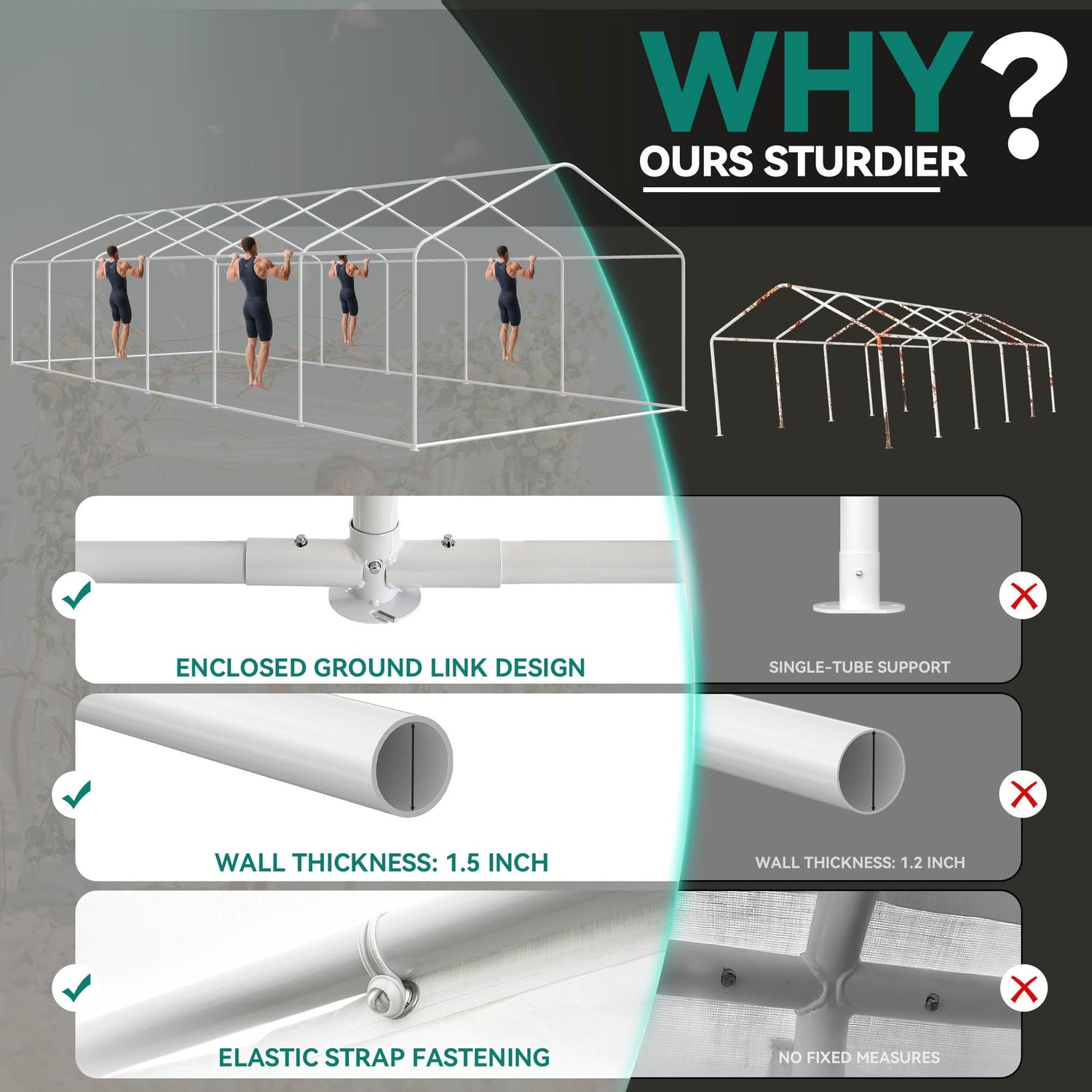 - UPGRADED FRAMEWORK- The heavy-duty white powder coated galvanized steel structure is anti-rust and anti-corrosion ; 1.5-inch (38 mm) steel tube diameter & 1.66-inch (42 mm) metal connector diameter help to provide strong support; Thick base strengthens our gazebo by providing immense stability and durability for outdoor activities