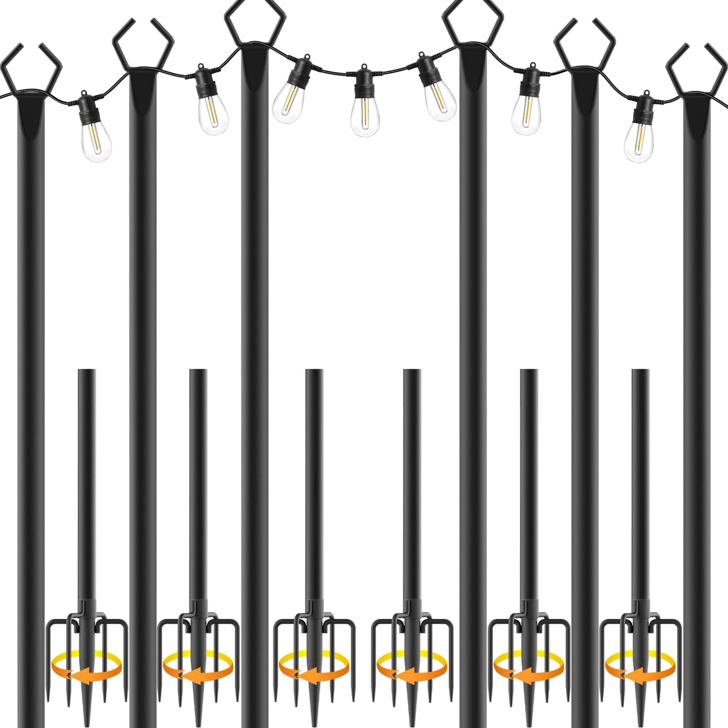 6 Pack 10 ft Heavy Duty Metal String Light Poles Adjustable Outdoor Lighting Stand for Patio,Backyard,Garden,Party & Wedding Rustproof & Sturdy with Hooks