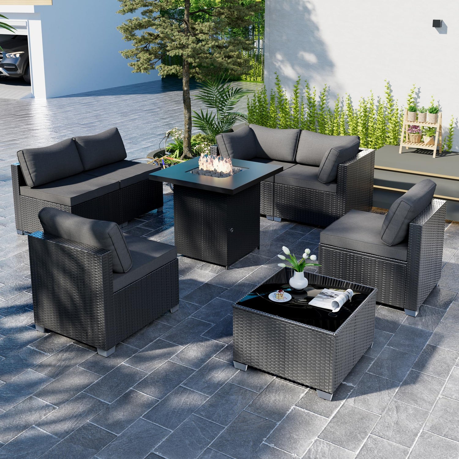 8-Piece Outdoor Patio Sectional Sofa Set with Fire Pit Table – PE Wicker Rattan Modular Conversation Furniture, Cushions & Clips Included – Patio Couch for Porch, Backyard, Poolside, Garden