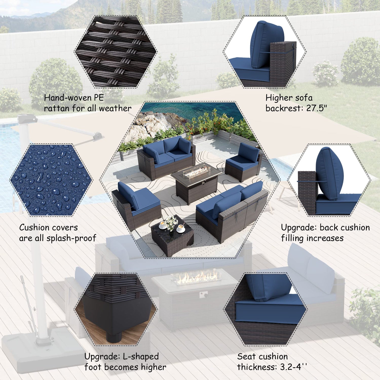 ALAULM 11 Pieces Patio Furniture Set with 2 Swivel Chairs Patio Furniture Outdoor Sectional Sofas with 55000 Gas Fire Pit Patio Conversation Set w/8 Cushions-Dark Blue