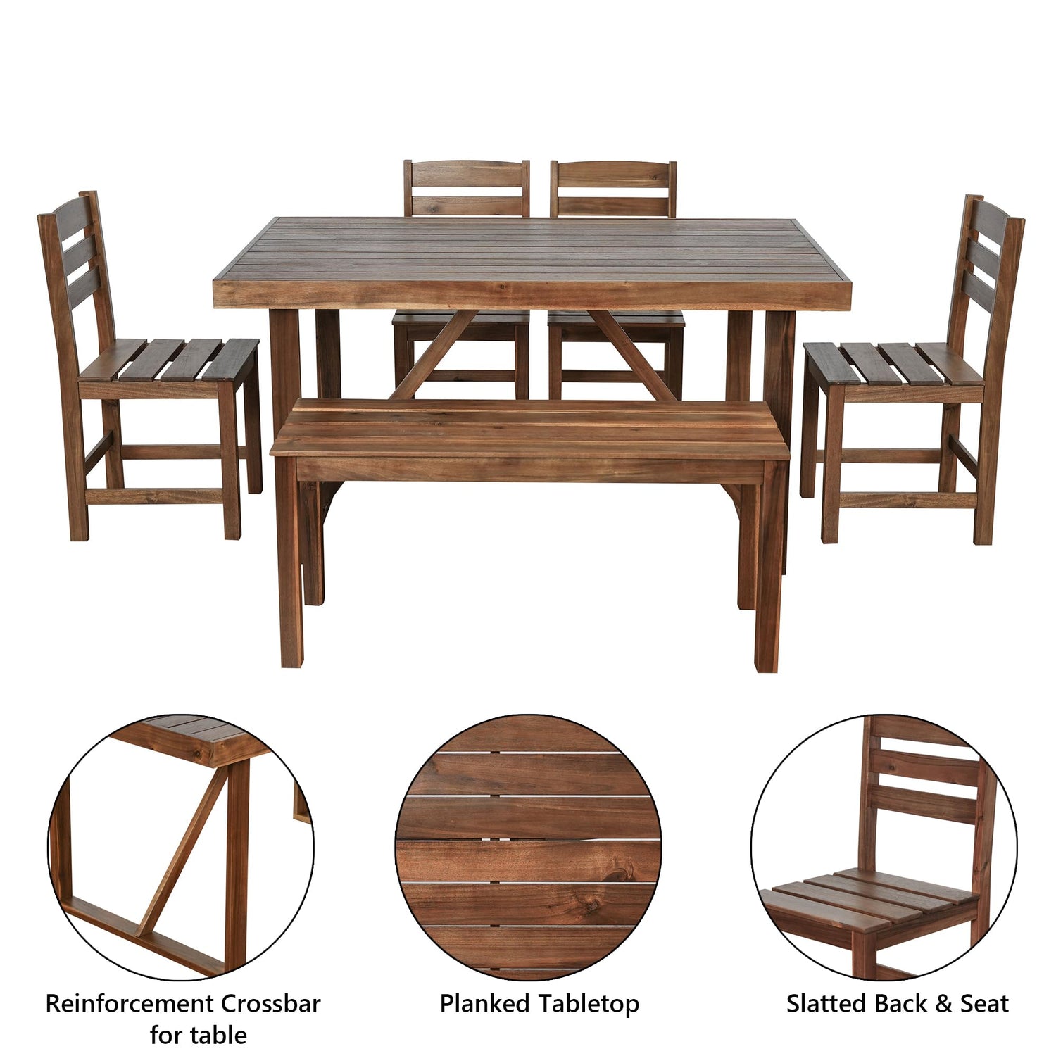 - This 6-piece dining set is durably made of acacia wood, providing excellent weather-resistant durability, good for patio, deck, garden, balcony and etc. It includes 1 dining table, 4 chairs and 1 bench.