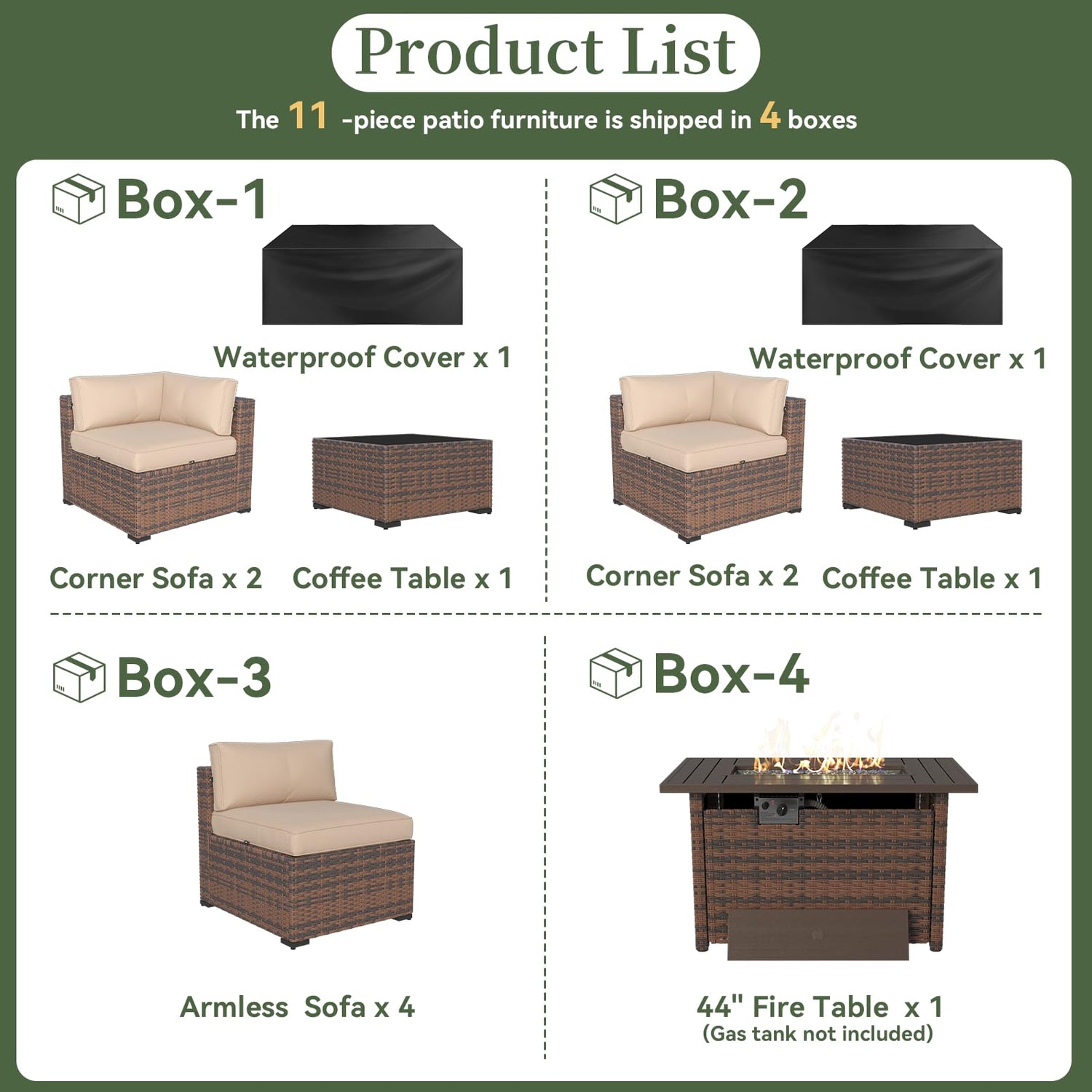 Details: Transform your patio into the ultimate warm space for unforgettable gatherings with the Aoxun 11 Piece Patio Furniture Set with Fire Pit Table! This set is the perfect choice for you. Imagine the joy of sitting on a sectional couch and enjoying the warmth of a propane fire pit table while you're gathering with friends! Specification:Material: Wicker Rattan & SteelStyle: GardenColor: BrownCertification: CSAPackage Includes:Armless Sofa x 4Corner Sofa x 4Coffer Table x 244” Fire Table x 1Furniture Cover x 1Note: Propane Tanke is not included
