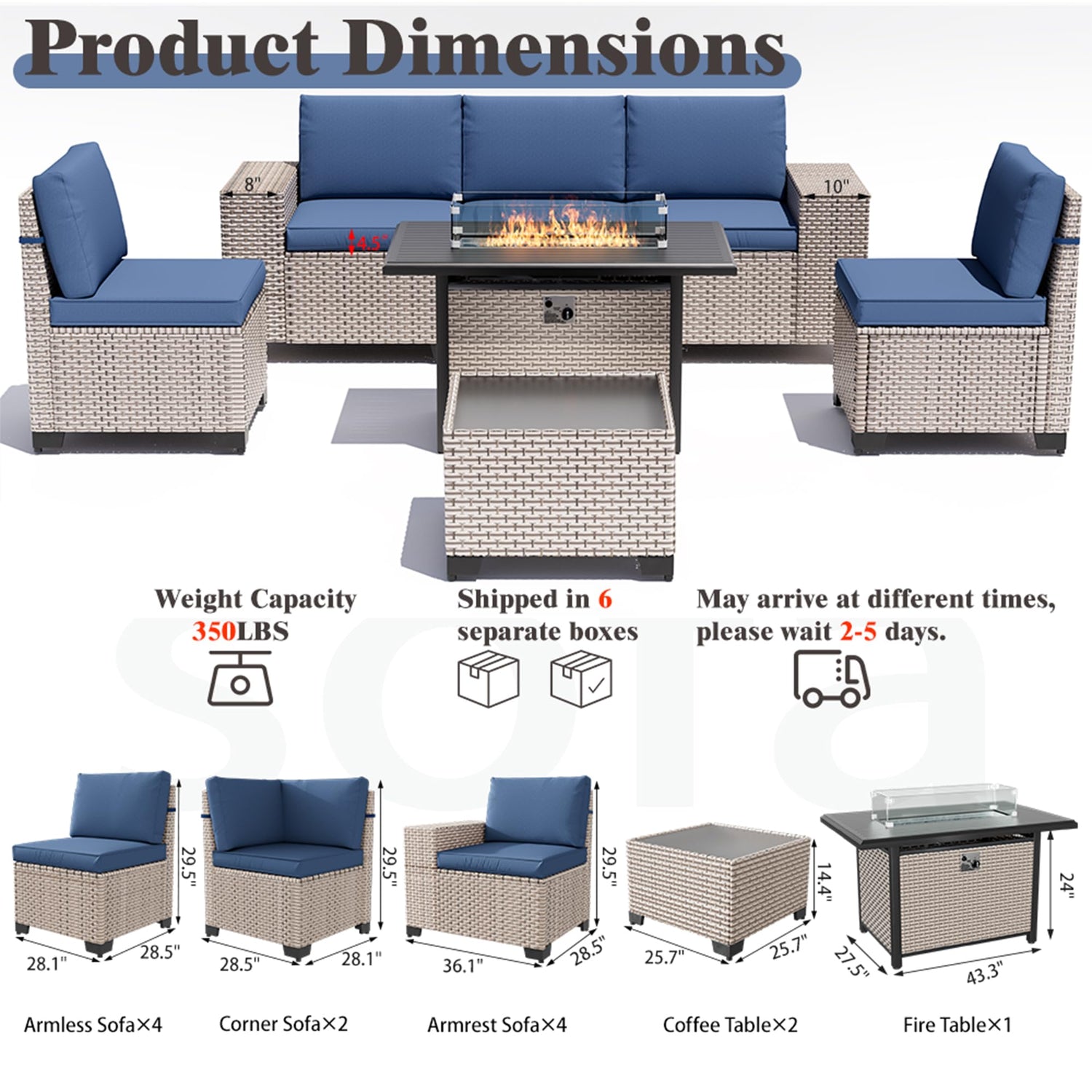 Aukreolis 13 Pieces Patio Furniture Set with Fire Pit Table, Outdoor Sectional Wicker Sofa with Thickened Cushions and Coffee Table, High Back Rattan Patio Conversation Sets, Navy