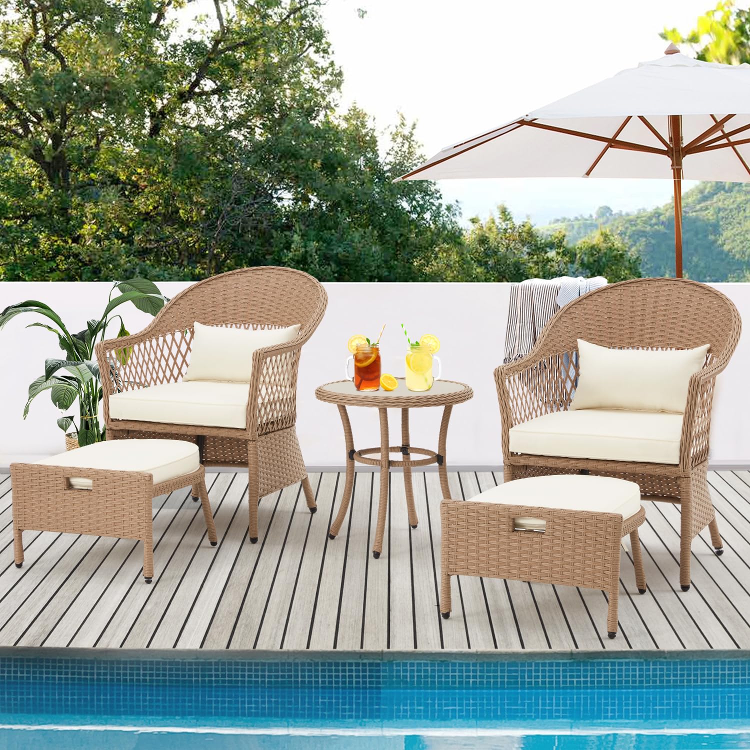 AVAWING 5 Pieces Patio Furniture Set, Outdoor Rattan Chairs with Round Glass Coffee Table, Ottomans & Soft Cushions, Wicker Conversation Bistro Set for Garden, Deck, Balcony, Poolside(Beige)