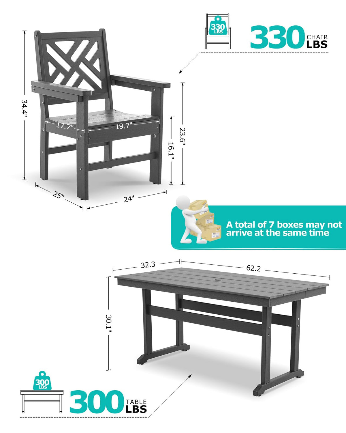 - 【Effortless Assembly & Care】 This outdoor dining set comes with detailed instructions and all necessary hardware for quick and easy setup. The HDPE material of this outdoor table and chairs cleans easily with just a damp cloth. Important: This set ships in 7 boxes, which may arrive separately. Please wait until you have received all boxes before beginning assembly.