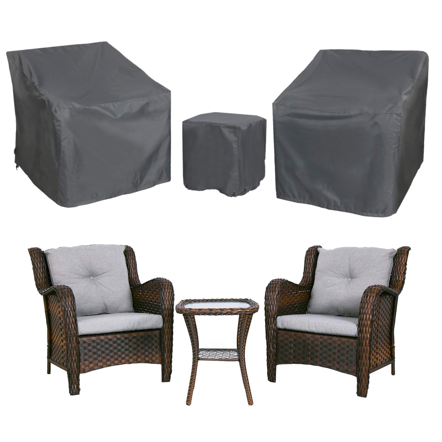• 【3 Pieces Patio Bistro Sets Cover】: Outdoor patio cover set designed for 3 pieces patio bistro sets, include 2 chair covers and 1 coffee table cover,total 3-piece furniture cover set