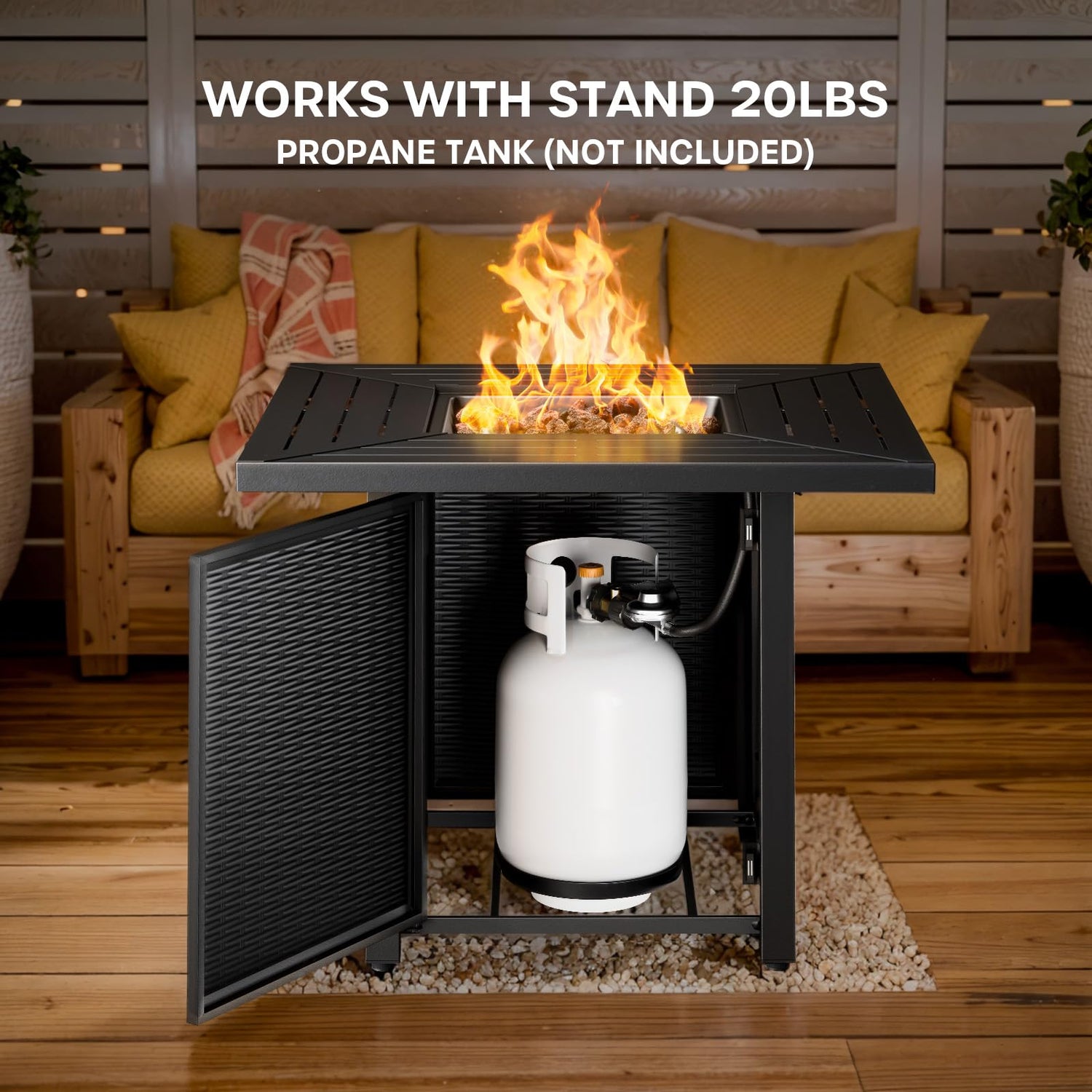 - 30IN IRON SQUARE FIRE PIT TABLE: The 30-inch iron square propane fire pit table boasts a sleek, modern design that stands out as a striking focal point. It provides cozy warmth and enhances your outdoor space with an elegant look.
