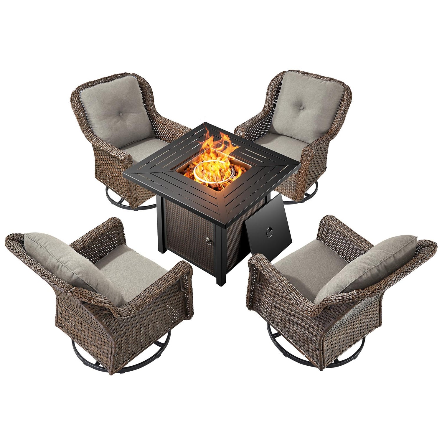 Bellefurn Patio Resin Wicker Furniture Set with Fire Pit Table, PE Rattan Swivel Patio Chairs with Propane Fire Pit Table, Brown Wicker 5PCS Patio Conversation Set