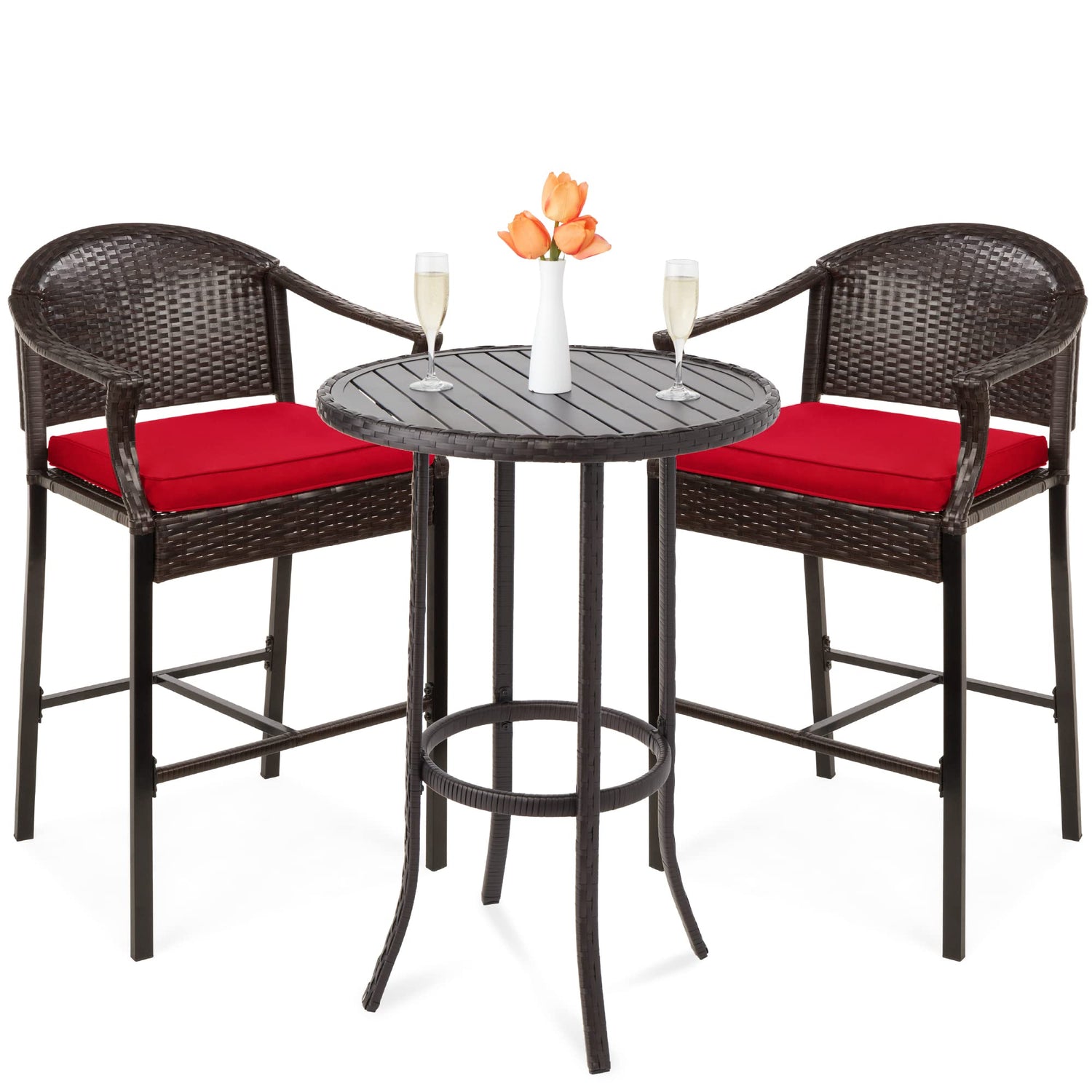 Best Choice Products 3-Piece Patio Bar Table Set, Outdoor Wicker Bar Height Bistro Furniture for Backyard, Poolside, Balcony w/Barstools, Cushions, Steel Frame – Brown/Red