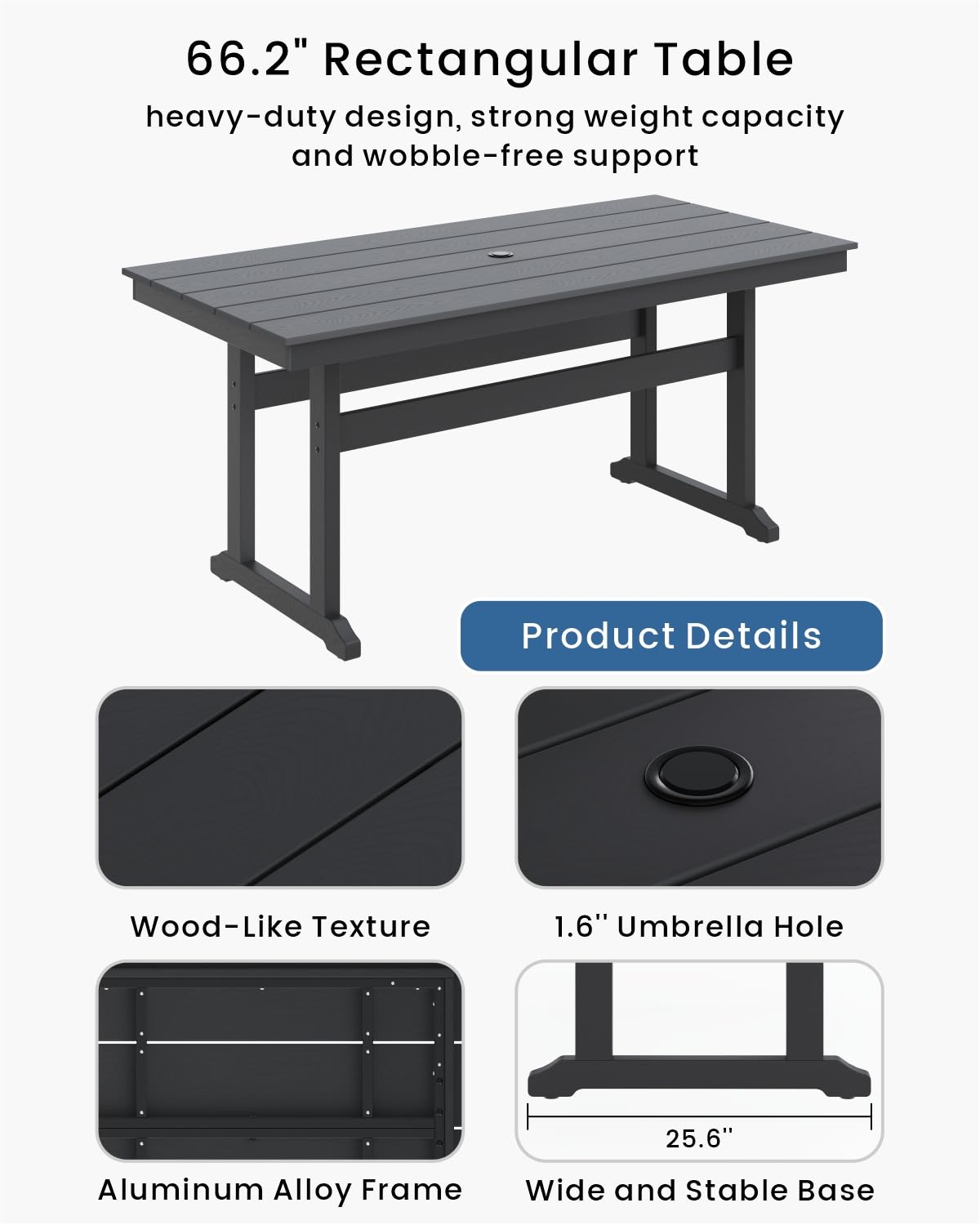 - Rectangle Dining Table with Umbrella Hole: Designed with a wide base and aluminum alloy frame for a stable, wobble-free structure; The slatted tabletop features an 1.6-inch umbrella hole for sunshade and drainage gaps to prevent water accumulation