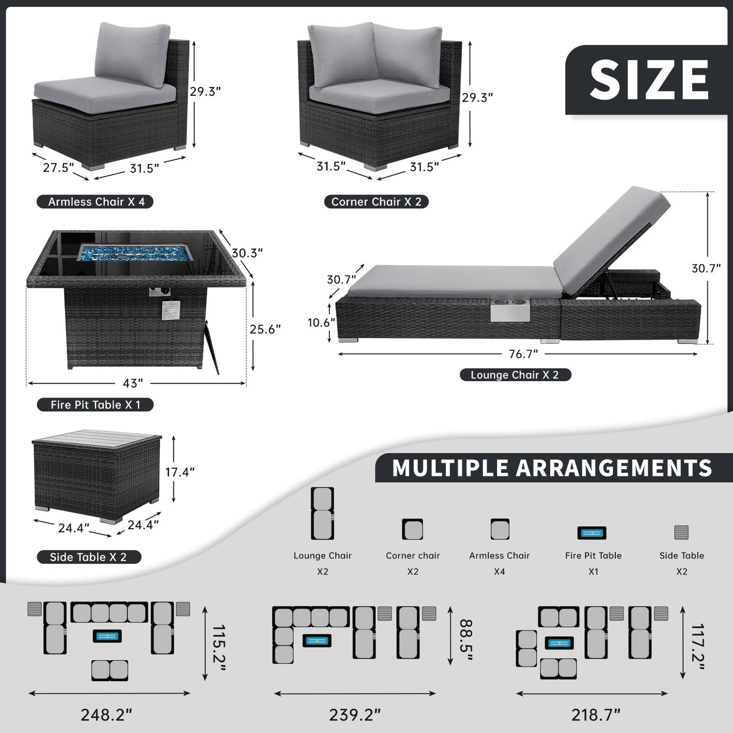 BULEXYARD 11 Piece Large High Back Outdoor Patio Furniture Sets with Firepit and Loungers, Cozy Extra Deep Wide Seating Sectional Conversation Couch Backyard Sitting Sets, Grey Wicker & Gray Cushion