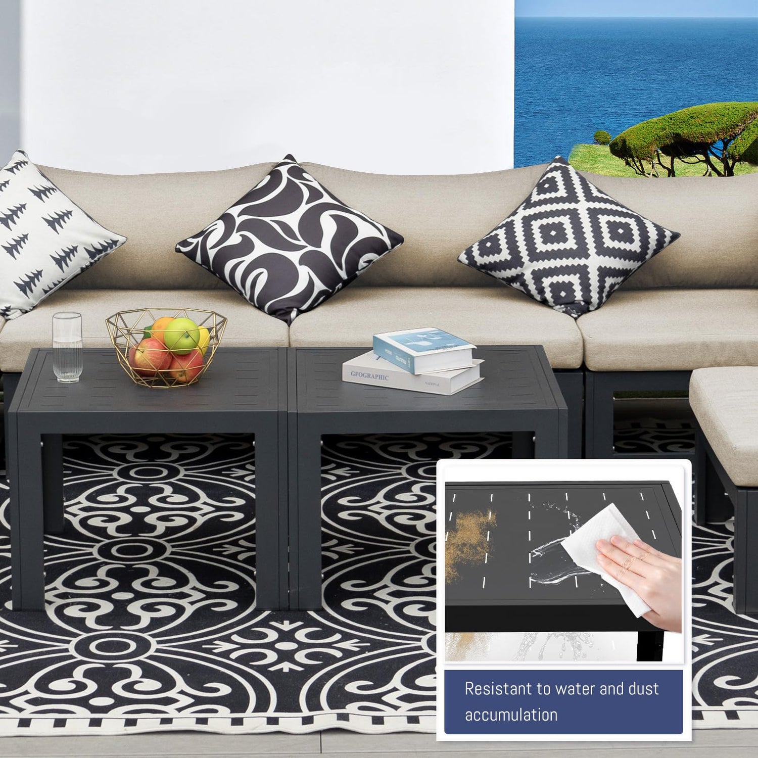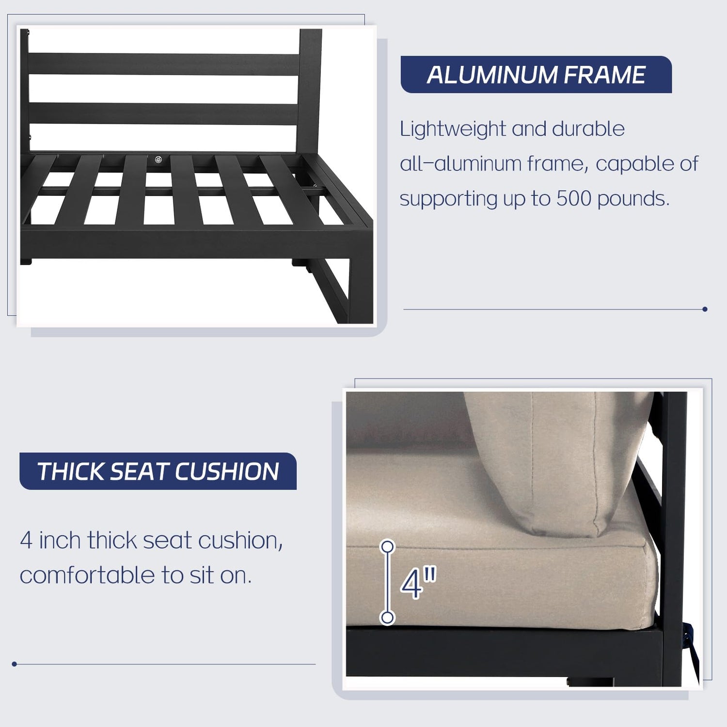 - Durability & Stability: Built with extruded 1.2mm aluminum tubing and precision welding, each aluminum outdoor sectional is reinforced at key stress points for long-lasting performance; The sturdy structure supports up to 500 lbs; While the premium powder-coated finish offers rust-resistant and anti-corrosion protection for easy care; Lightweight and easy to move, each sectional can be repositioned by one person easily, making rearranging your outdoor space effortless