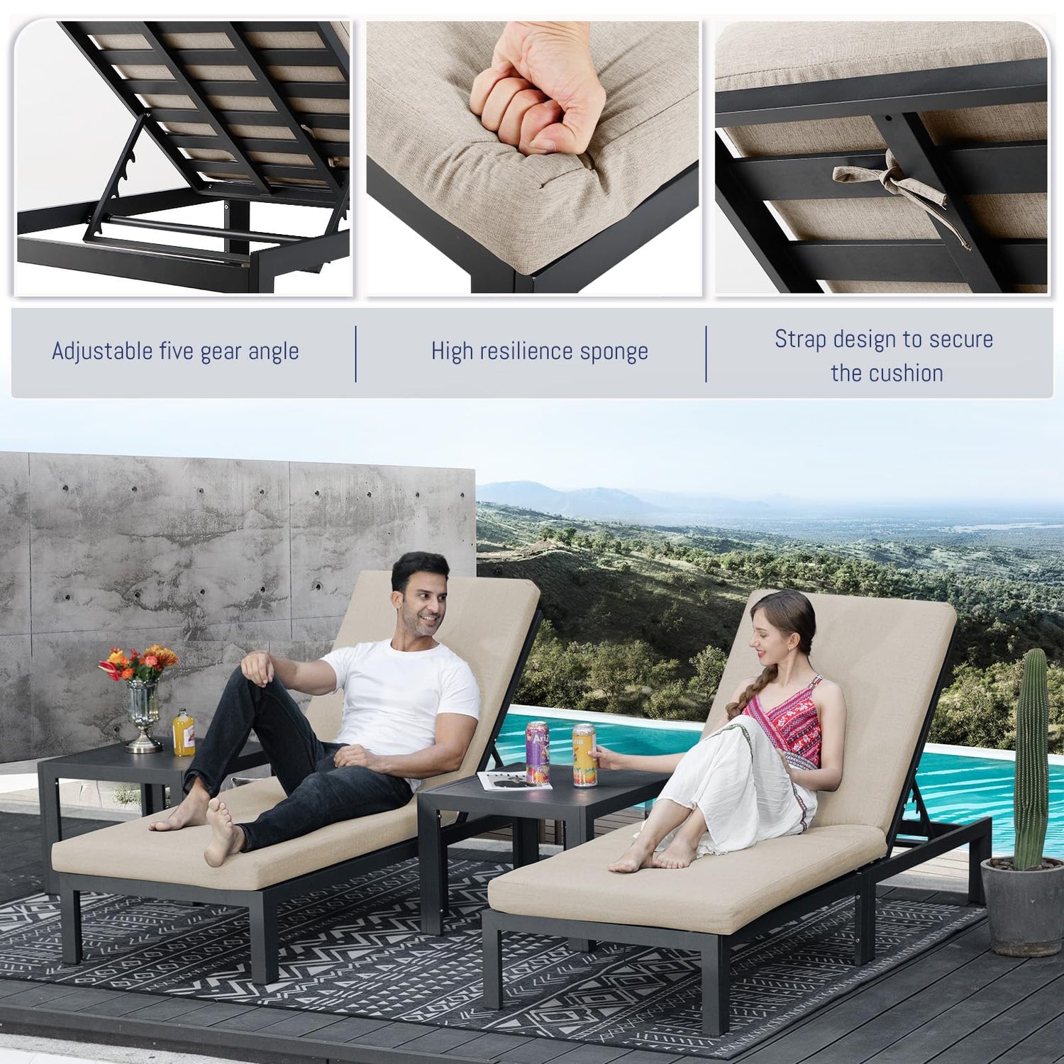 - Extra Large & Wide Chaise: Measuring 78.7"×29.5" with a 4" cushion, it allows you to lounge in spacious comfort; The sturdy all-aluminum frame ensures even weight support for safe, stable lounging; Powder-coated and rust-resistant, it’s ideal for poolside use with lasting durability in wet conditions; The 6-position adjustable backrest reclines from 14.9"–39.3", letting you lie flat for sunbathing or sit to enjoy a drink