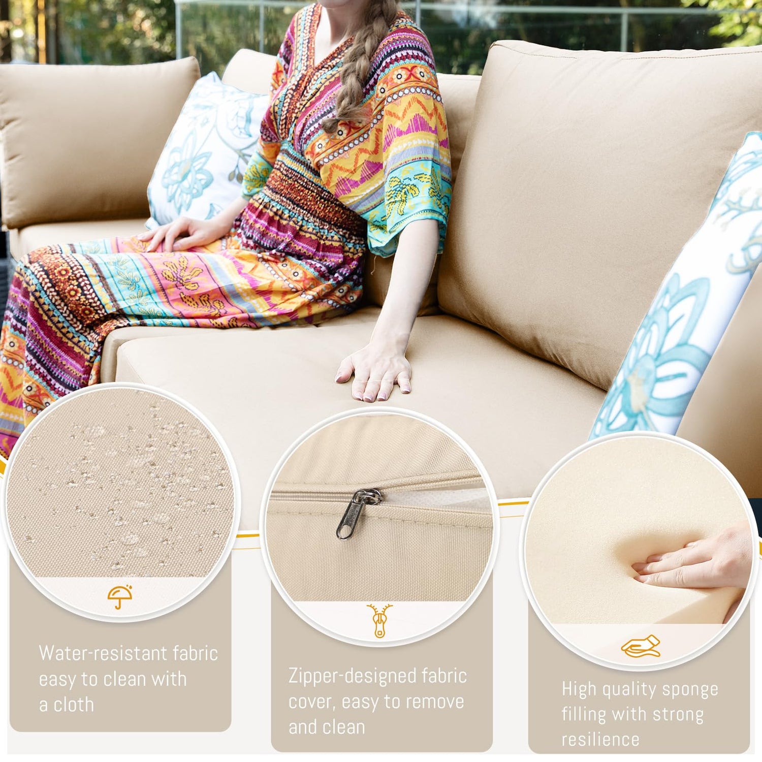 - Built to Last with Weather Resistance: Designed for year-round use, this patio sectional features a rust-resistant steel frame and all-weather wicker that resists fading and cracking; The water-resistant cushion covers are made with fabric that is UV/fade-resistant, having undergone over 2000 hours of sun exposure testing to ensure your set stays fresh and vibrant, even after prolonged exposure to the elements; This level of durability ensures long-lasting beauty and minimal maintenance