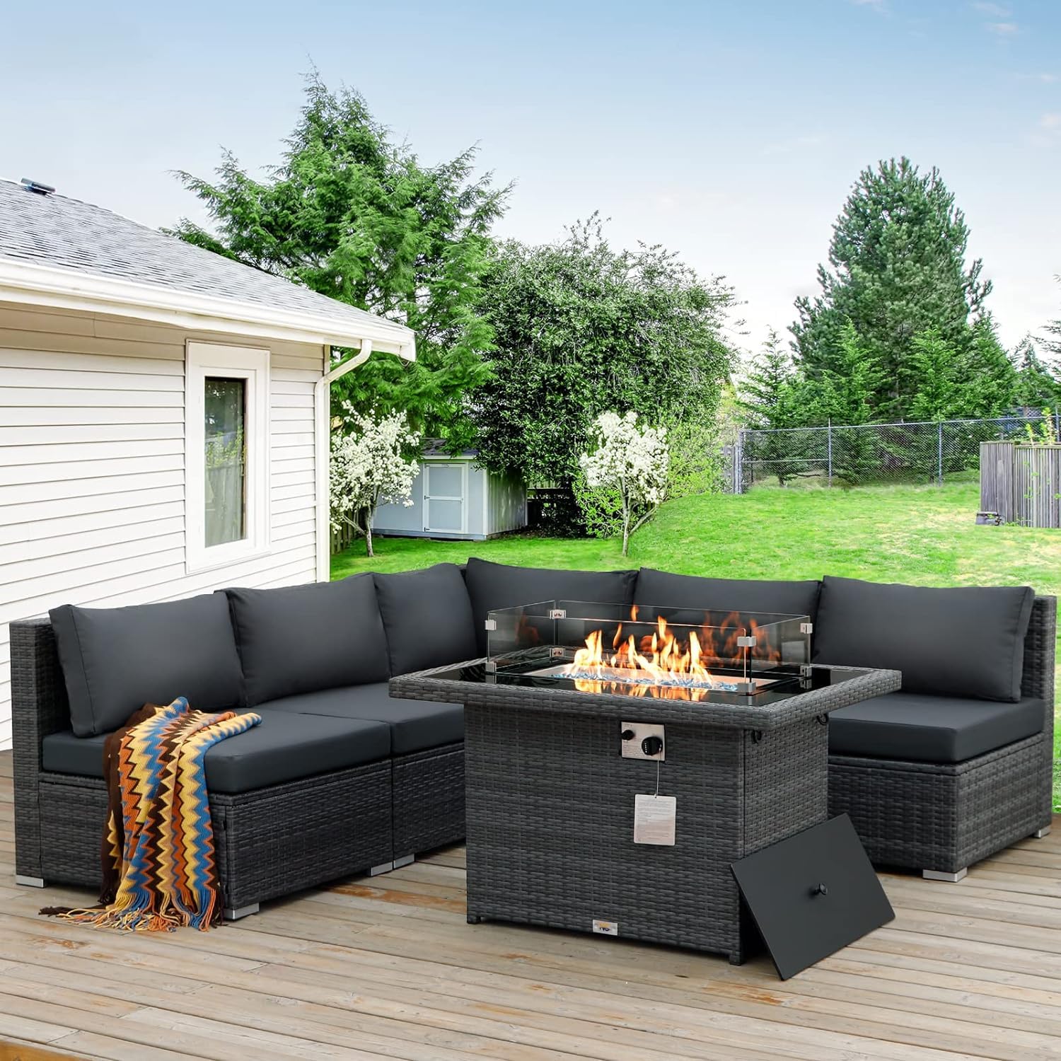 BULEXYARD 6 Pcs High Back Outdoor Patio Furniture Set with Fire Pit, Extra Large L-Shaped Deep Wide Backyard Sectional Seating, Heavy Duty All-Weather Wicker Modular Conversation Couch 5-Seater, Grey