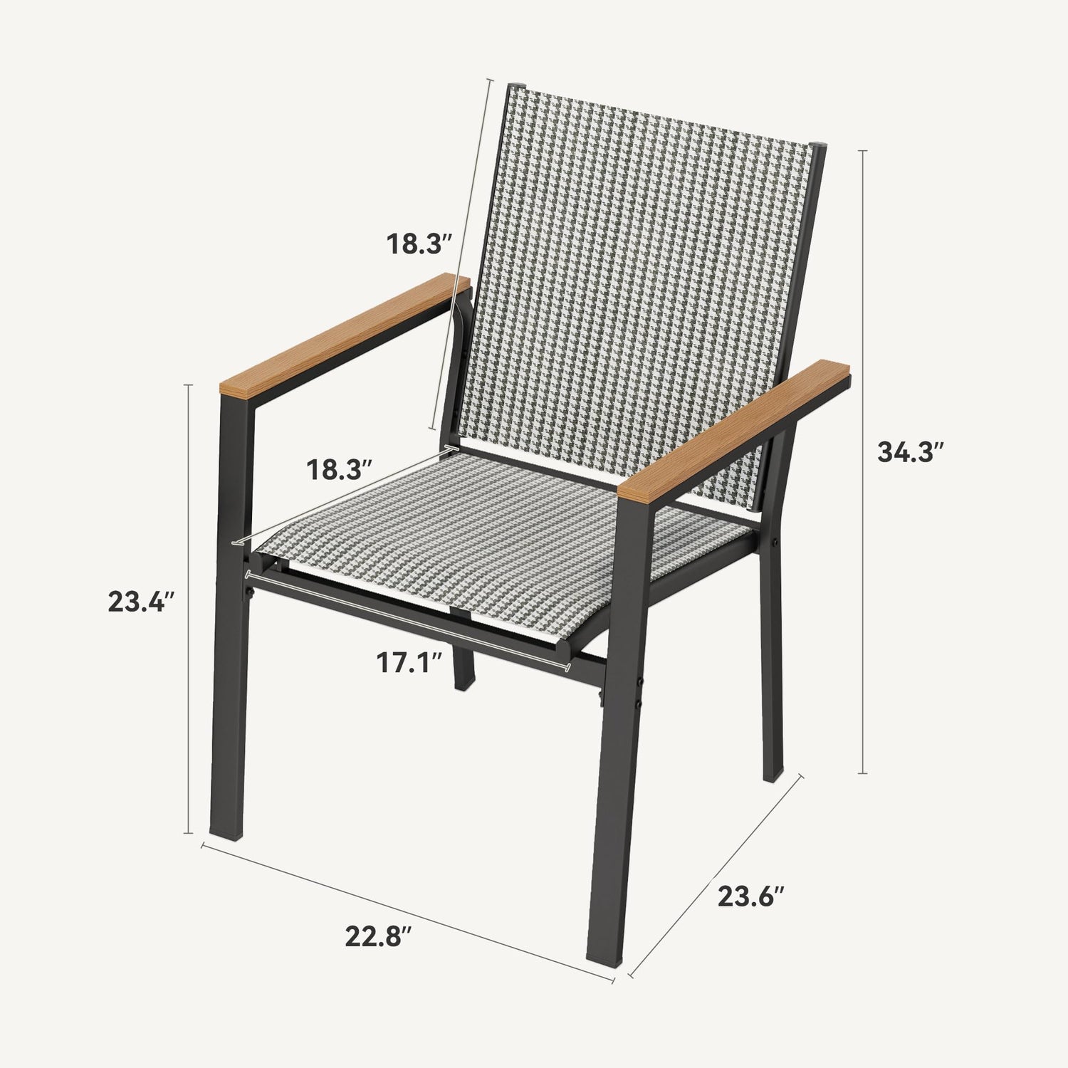 - Timeless Design Compatibility: With a sleek black and white plaid pattern, these stackable outdoor chairs seamlessly complement any dining table, enhancing your patio with a cohesive and stylish look